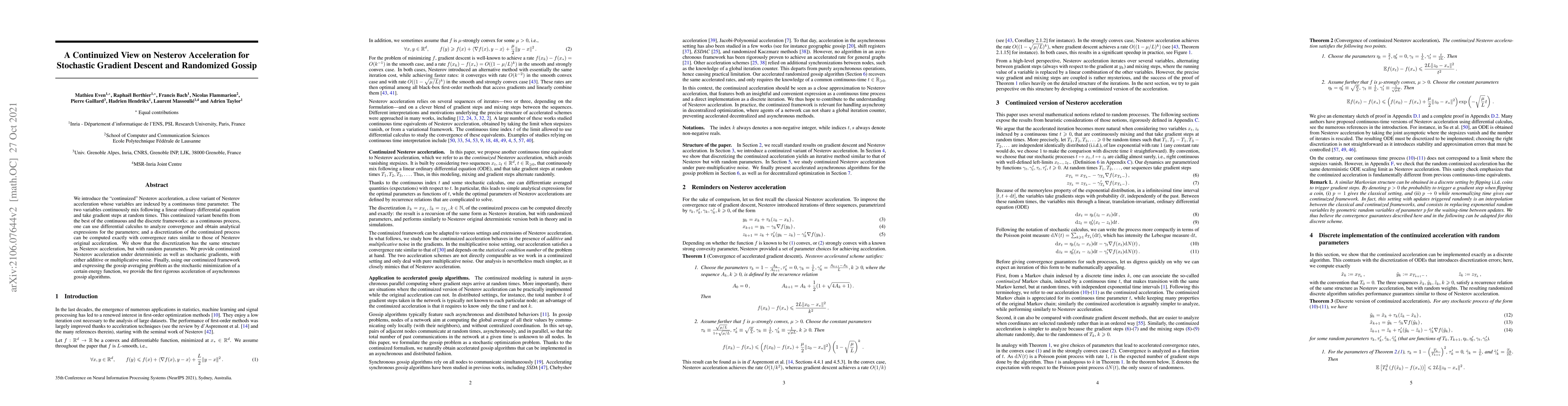This paper introduces a continuized variant of Nesterov acceleration for stochastic gradient descent, which blends continuous and discrete frameworks. It provides analytical convergence analysis and shows that discretized versions maintain similar convergence rates to the original Nesterov method, while also rigorously accelerating asynchronous gossip algorithms.