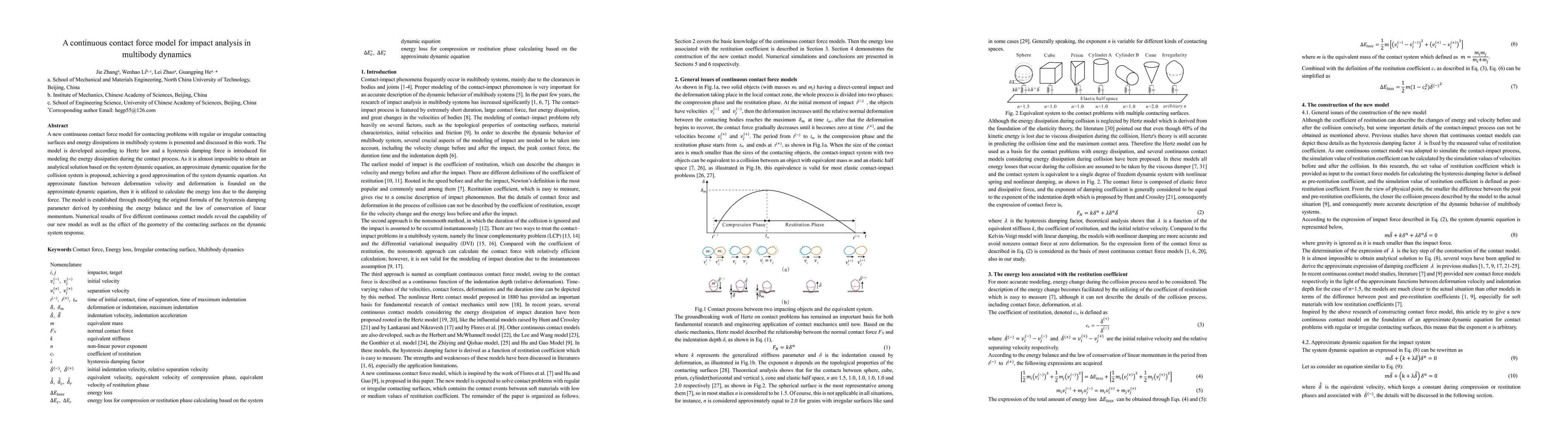 A new continuous contact force model for contacting problems with regular or irregular contacting surfaces and energy dissipations in multibody systems is presented and discussed in this work. The model is developed according to Hertz law and a hysteresis damping force is introduced for modeling the energy dissipation during the contact process. As it is almost impossible to obtain an analytical solution based on the system dynamic equation, an approximate dynamic equation for the collision system is proposed, achieving a good approximation of the system dynamic equation. An approximate function between deformation velocity and deformation is founded on the approximate dynamic equation, then it is utilized to calculate the energy loss due to the damping force. The model is established through modifying the original formula of the hysteresis damping parameter derived by combining the energy balance and the law of conservation of linear momentum. Numerical results of five different continuous contact models reveal the capability of our new model as well as the effect of the geometry of the contacting surfaces on the dynamic system response.