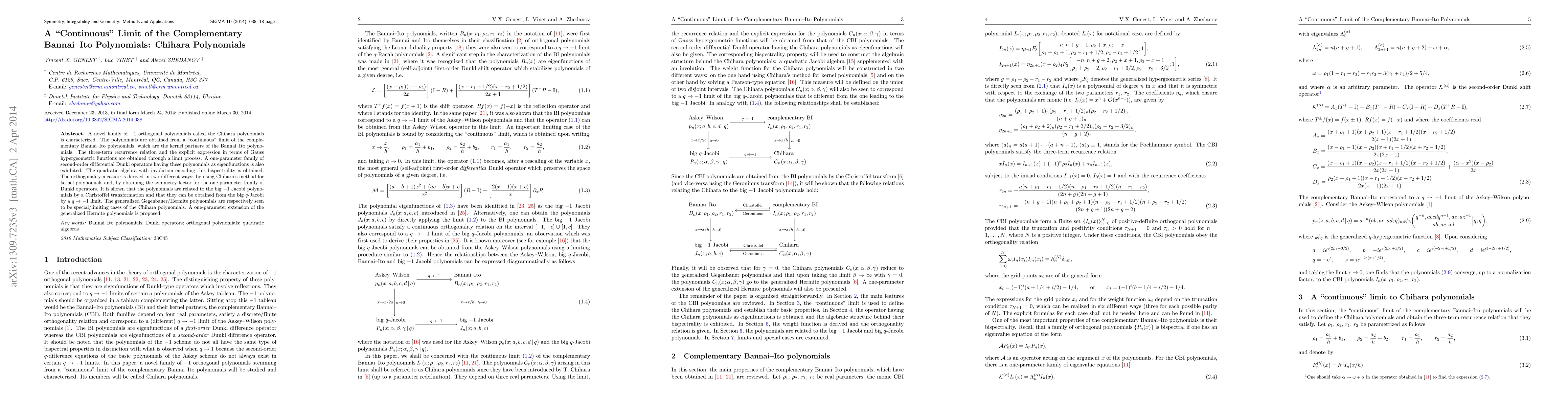A novel family of $-1$ orthogonal polynomials called the Chihara polynomials is characterized. The polynomials are obtained from a "continuous" limit of the complementary Bannai-Ito polynomials, which are the kernel partners of the Bannai-Ito polynomials. The three-term recurrence relation and the explicit expression in terms of Gauss hypergeometric functions are obtained through a limit process. A one-parameter family of second-order differential Dunkl operators having these polynomials as eigenfunctions is also exhibited. The quadratic algebra with involution encoding this bispectrality is obtained. The orthogonality measure is derived in two different ways: by using Chihara's method for kernel polynomials and, by obtaining the symmetry factor for the one-parameter family of Dunkl operators. It is shown that the polynomials are related to the big $-1$ Jacobi polynomials by a Christoffel transformation and that they can be obtained from the big $q$-Jacobi by a $q\rightarrow -1$ limit. The generalized Gegenbauer/Hermite polynomials are respectively seen to be special/limiting cases of the Chihara polynomials. A one-parameter extension of the generalized Hermite polynomials is proposed.
