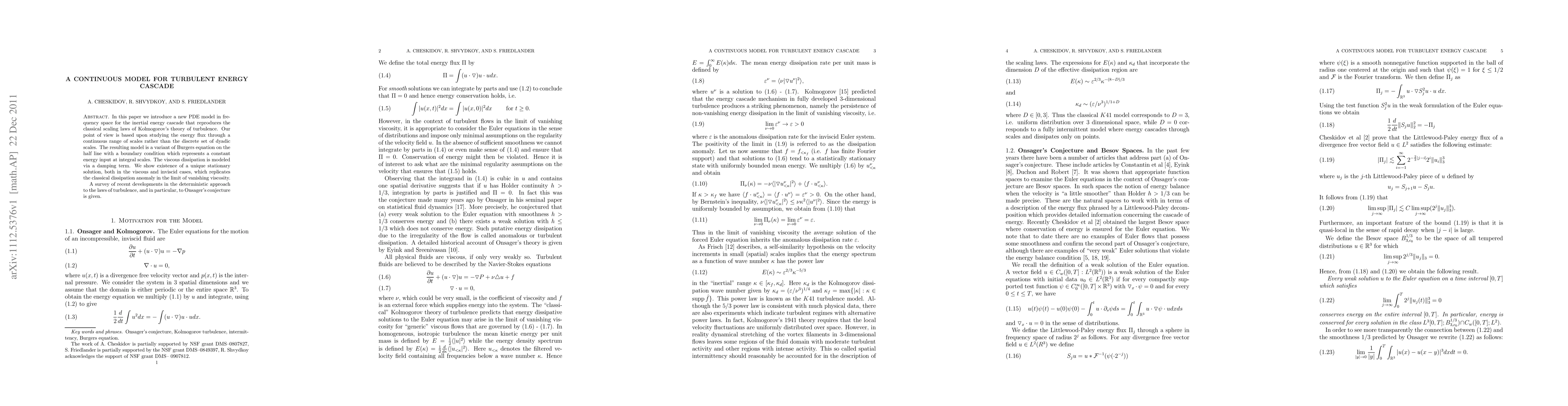 In this paper we introduce a new PDE model in frequency space for the inertial energy cascade that reproduces the classical scaling laws of Kolmogorov's theory of turbulence. Our point of view is based upon studying the energy flux through a continuous range of scales rather than the discrete set of dyadic scales. The resulting model is a variant of Burgers equation on the half line with a boundary condition which represents a constant energy input at integral scales. The viscous dissipation is modeled via a damping term. We show existence of a unique stationary solution, both in the viscous and inviscid cases, which replicates the classical dissipation anomaly in the limit of vanishing viscosity. A survey of recent developments in the deterministic approach to the laws of turbulence, and in particular, to Onsager's conjecture is given.