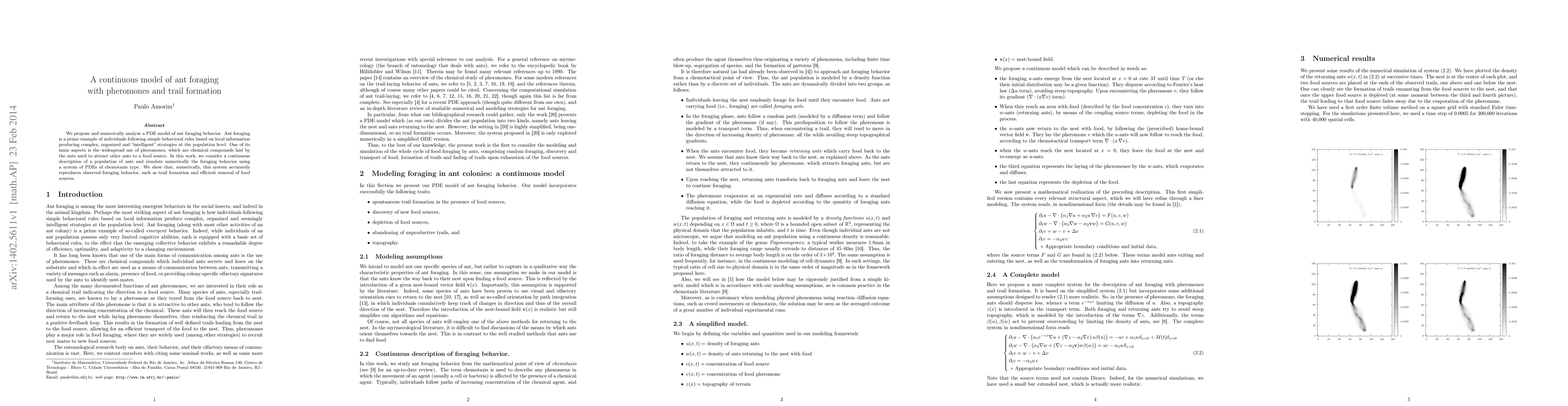 This paper proposes a PDE model to simulate ant foraging behavior, focusing on pheromone-based trail formation. Numerical analysis demonstrates the model's ability to replicate observed foraging strategies, including efficient trail creation and food source exploitation.