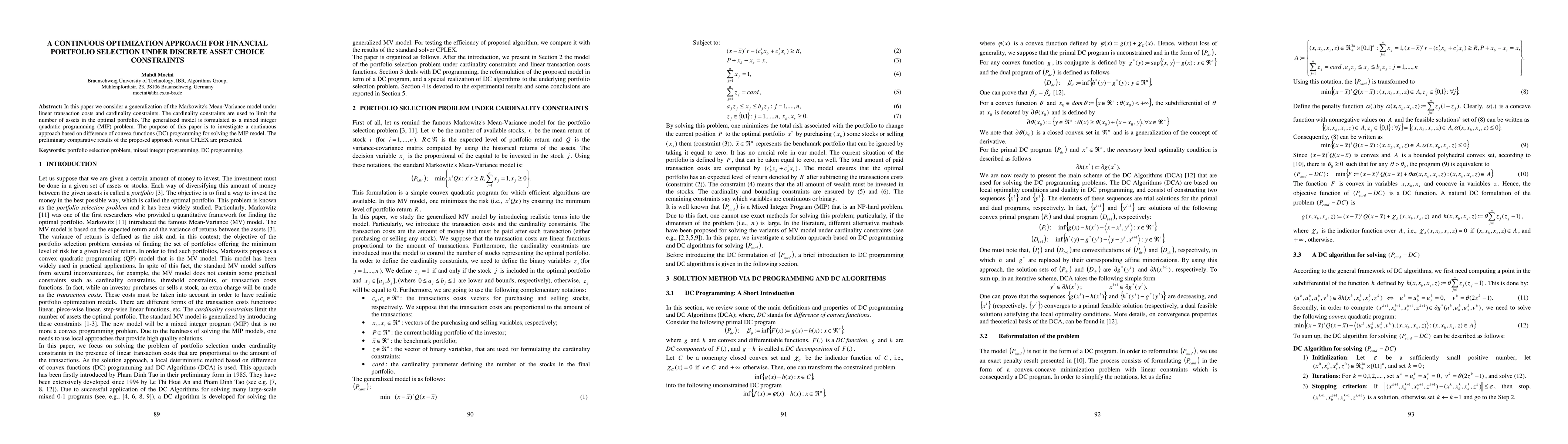 In this paper we consider a generalization of the Markowitz's Mean-Variance model under linear transaction costs and cardinality constraints. The cardinality constraints are used to limit the number of assets in the optimal portfolio. The generalized model is formulated as a mixed integer quadratic programming (MIP) problem. The purpose of this paper is to investigate a continuous approach based on difference of convex functions (DC) programming for solving the MIP model. The preliminary comparative results of the proposed approach versus CPLEX are presented.