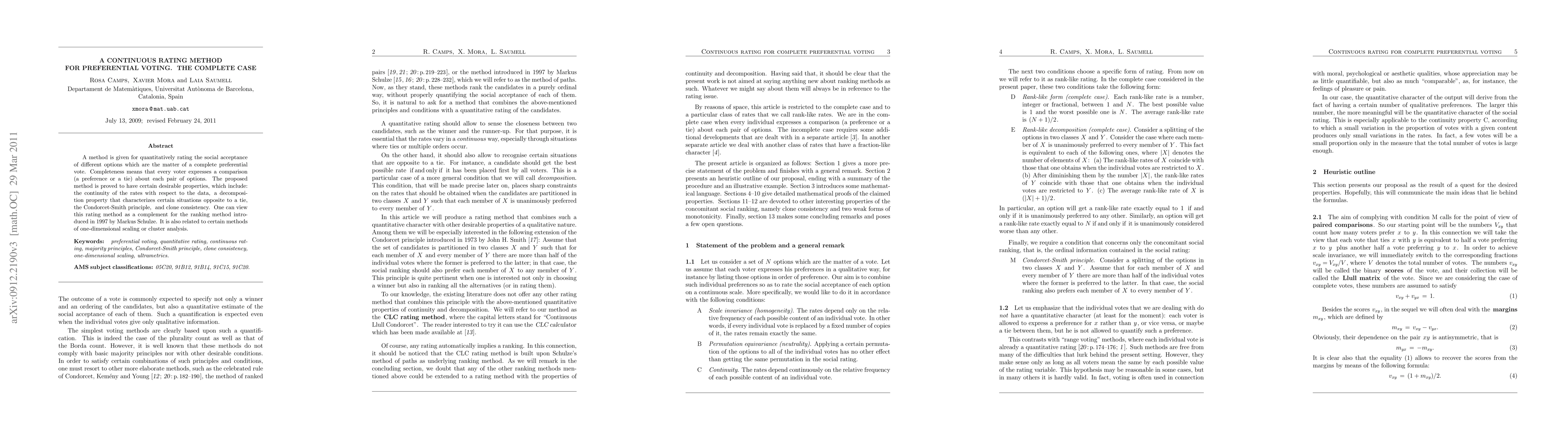 A method for rating social acceptance of options in complete preferential voting is presented, with desirable properties including continuity and a Condorcet-Smith principle, offering an alternative to ranking methods.