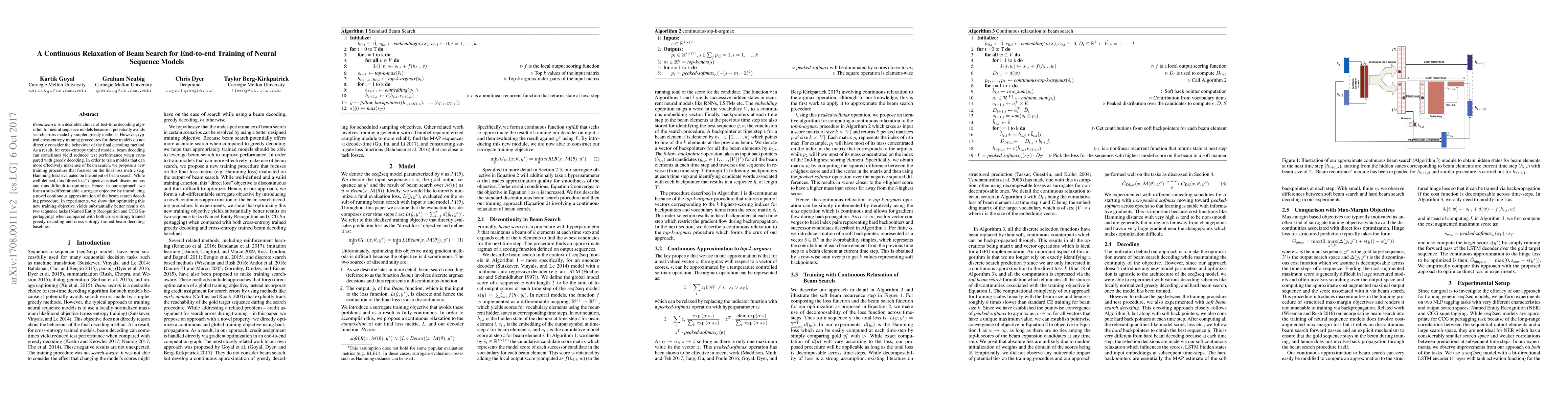 Researchers developed a new training procedure to improve the performance of neural sequence models using beam search, resulting in better test results for Named Entity Recognition and CCG Supertagging tasks.