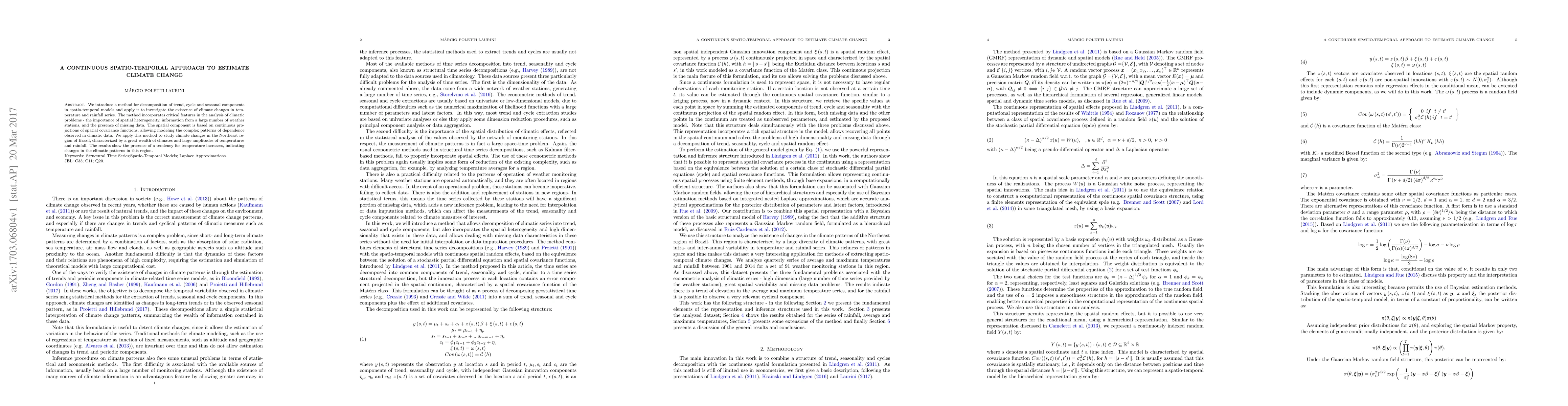 This paper proposes a continuous spatio-temporal method to decompose trend, cycle, and seasonal components in climatic data, focusing on spatial heterogeneity and handling missing data. Applied to the Northeast region of Brazil, the method reveals a tendency for increasing temperatures, indicating significant climate change patterns.
