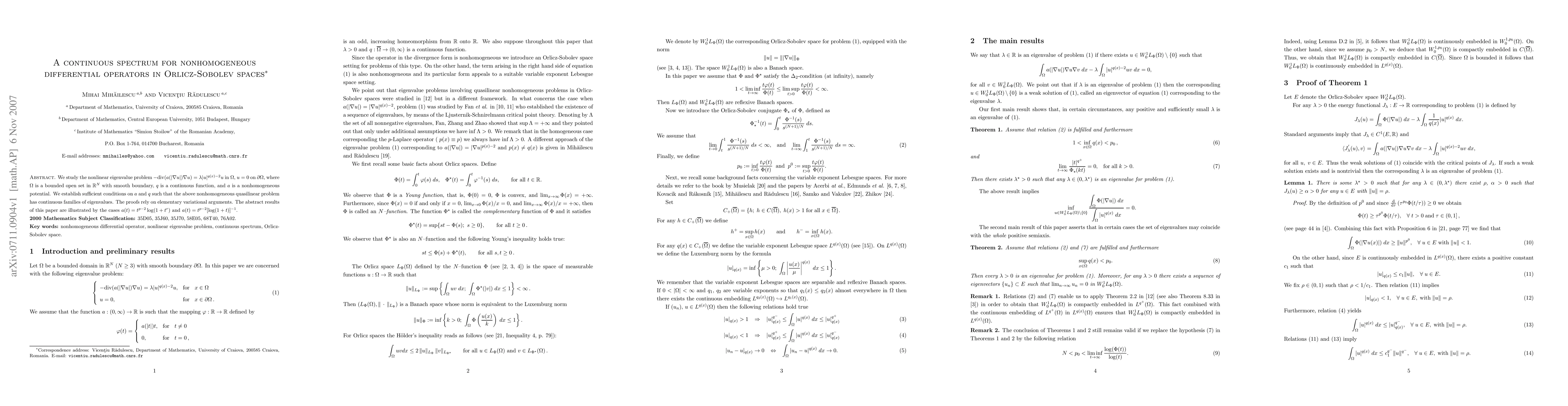 We study the nonlinear eigenvalue problem $-{\rm div}(a(|\nabla u|)\nabla u)=\lambda|u|^{q(x)-2}u$ in $\Omega$, $u=0$ on $\partial\Omega$, where $\Omega$ is a bounded open set in $\RR^N$ with smooth boundary, $q$ is a continuous function, and $a$ is a nonhomogeneous potential. We establish sufficient conditions on $a$ and $q$ such that the above nonhomogeneous quasilinear problem has continuous families of eigenvalues. The proofs rely on elementary variational arguments. The abstract results of this paper are illustrated by the cases $a(t)=t^{p-2}\log (1+t^r)$ and $a(t)= t^{p-2} [\log (1+t)]^{-1}$.
