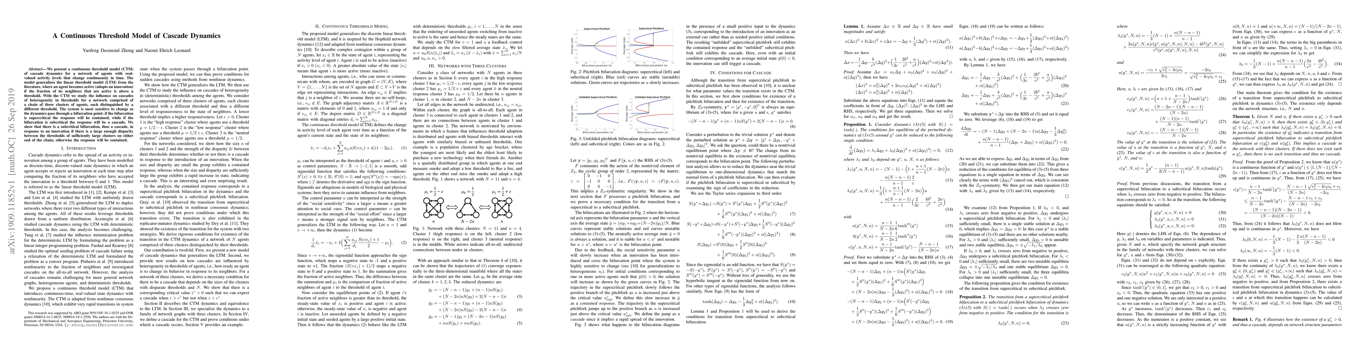This paper introduces a continuous threshold model (CTM) to study cascade dynamics in networks of agents with varying activity levels. It demonstrates that a subcritical bifurcation leads to a cascade when there is a significant threshold disparity between large clusters, otherwise, the response remains contained.