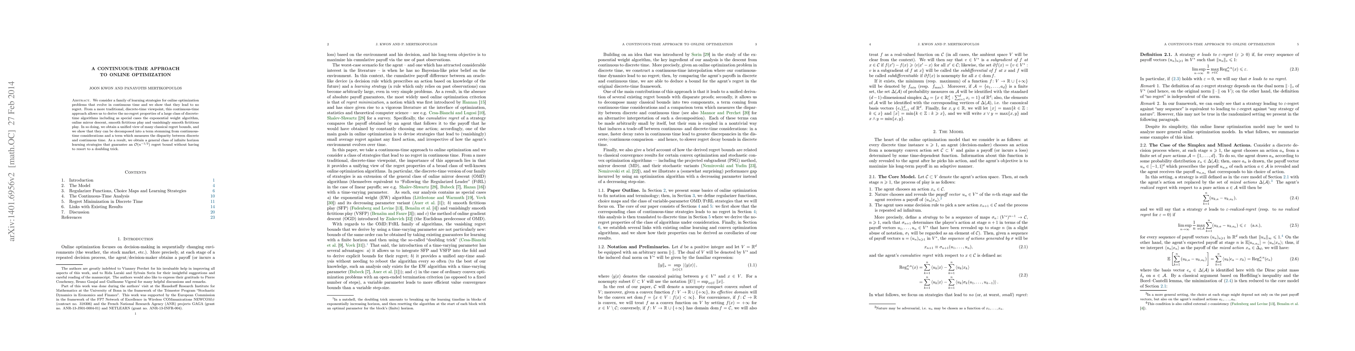 This paper presents a continuous-time approach to online optimization, demonstrating that it leads to no regret and provides a unified view of various discrete-time algorithms. It achieves an $\mathcal{O}(n^{-1/2})$ regret bound without using the doubling trick, decomposing classical regret bounds into continuous-time and discrete-time disparity terms.