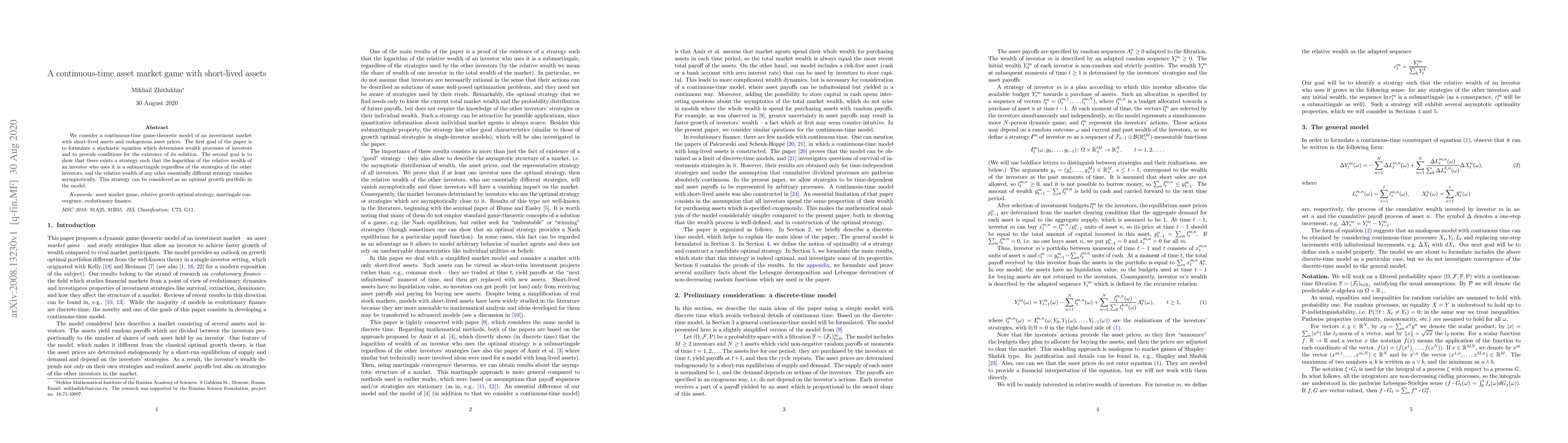 We consider a continuous-time game-theoretic model of an investment market with short-lived assets and endogenous asset prices. The first goal of the paper is to formulate a stochastic equation which determines wealth processes of investors and to provide conditions for the existence of its solution. The second goal is to show that there exists a strategy such that the logarithm of the relative wealth of an investor who uses it is a submartingale regardless of the strategies of the other investors, and the relative wealth of any other essentially different strategy vanishes asymptotically. This strategy can be considered as an optimal growth portfolio in the model.