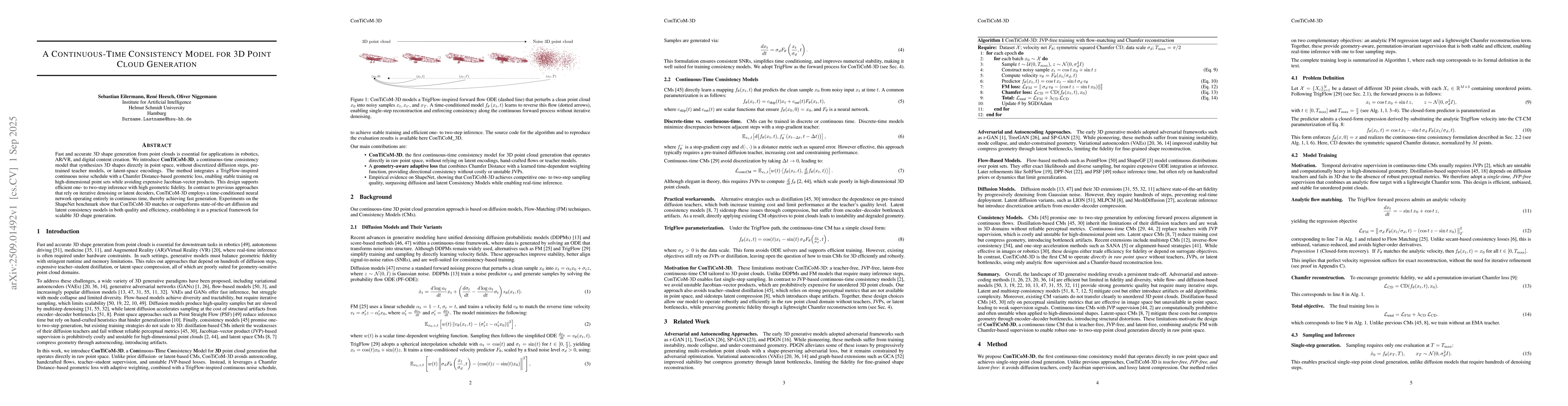 Fast and accurate 3D shape generation from point clouds is essential for applications in robotics, AR/VR, and digital content creation. We introduce ConTiCoM-3D, a continuous-time consistency model that synthesizes 3D shapes directly in point space, without discretized diffusion steps, pre-trained teacher models, or latent-space encodings. The method integrates a TrigFlow-inspired continuous noise schedule with a Chamfer Distance-based geometric loss, enabling stable training on high-dimensional point sets while avoiding expensive Jacobian-vector products. This design supports efficient one- to two-step inference with high geometric fidelity. In contrast to previous approaches that rely on iterative denoising or latent decoders, ConTiCoM-3D employs a time-conditioned neural network operating entirely in continuous time, thereby achieving fast generation. Experiments on the ShapeNet benchmark show that ConTiCoM-3D matches or outperforms state-of-the-art diffusion and latent consistency models in both quality and efficiency, establishing it as a practical framework for scalable 3D shape generation.