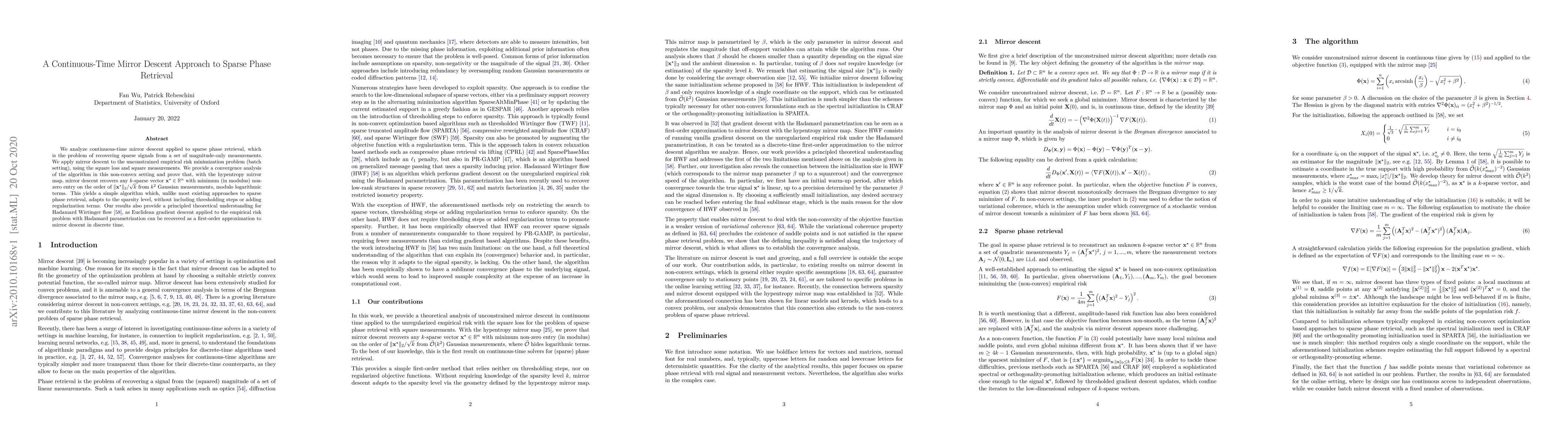 We analyze continuous-time mirror descent applied to sparse phase retrieval, which is the problem of recovering sparse signals from a set of magnitude-only measurements. We apply mirror descent to the unconstrained empirical risk minimization problem (batch setting), using the square loss and square measurements. We provide a convergence analysis of the algorithm in this non-convex setting and prove that, with the hypentropy mirror map, mirror descent recovers any $k$-sparse vector $\mathbf{x}^\star\in\mathbb{R}^n$ with minimum (in modulus) non-zero entry on the order of $\| \mathbf{x}^\star \|_2/\sqrt{k}$ from $k^2$ Gaussian measurements, modulo logarithmic terms. This yields a simple algorithm which, unlike most existing approaches to sparse phase retrieval, adapts to the sparsity level, without including thresholding steps or adding regularization terms. Our results also provide a principled theoretical understanding for Hadamard Wirtinger flow [58], as Euclidean gradient descent applied to the empirical risk problem with Hadamard parametrization can be recovered as a first-order approximation to mirror descent in discrete time.