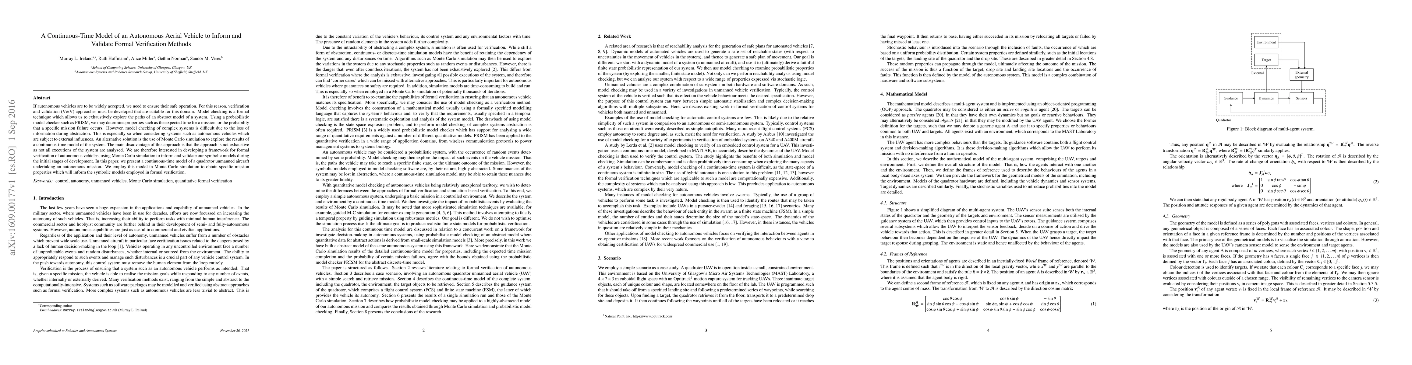 This paper presents a continuous-time model of an autonomous aerial vehicle to inform and validate formal verification methods, using Monte Carlo simulation to explore mission properties and guide the development of symbolic models for model checking. The approach aims to address the challenges of verifying complex systems like autonomous vehicles by combining simulation and formal methods.