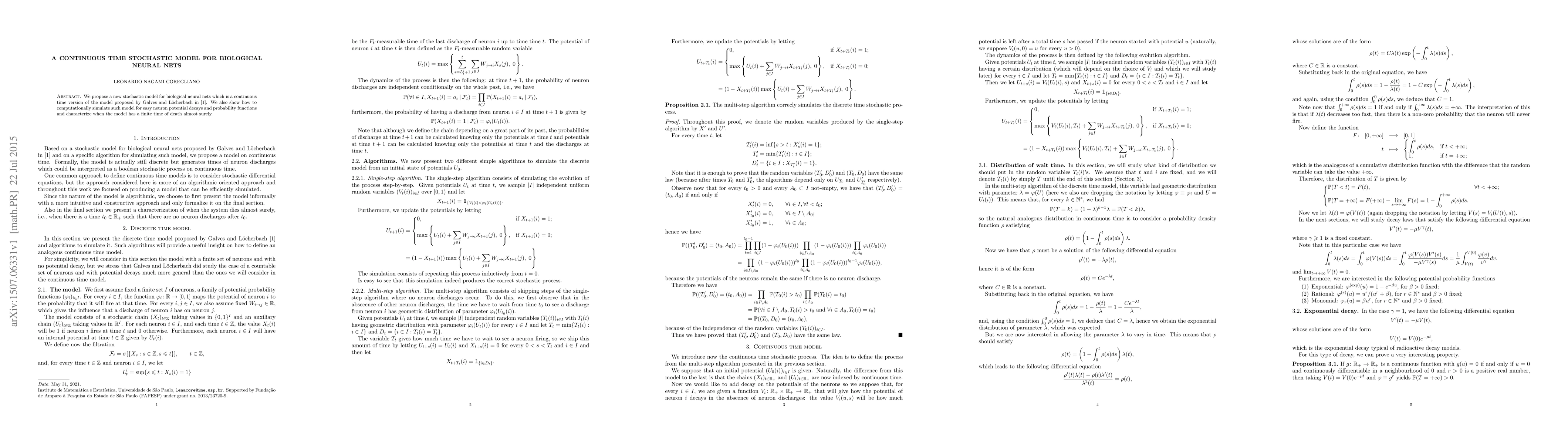 This paper introduces a continuous time stochastic model for biological neural networks, extending the discrete model by Galves and Löcherbach, and provides a computational framework for simulating neuron potential decays and probability functions, while also analyzing conditions under which the model exhibits a finite time of death almost surely.