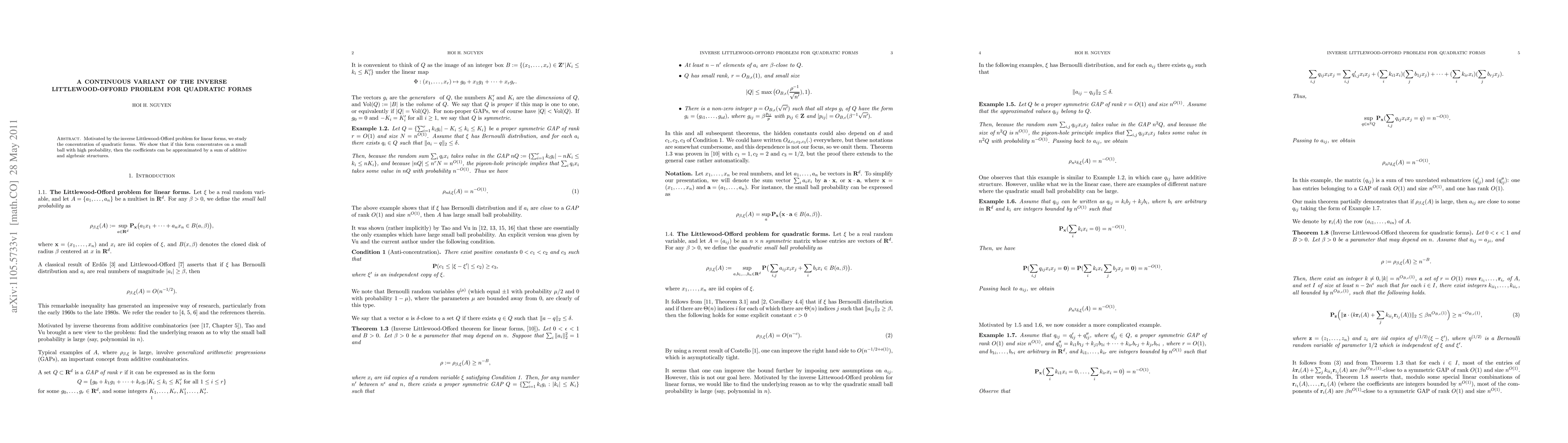 Researchers studied how quadratic forms concentrate on small areas with high probability and found that the coefficients can be approximated using additive and algebraic structures. This discovery has implications for understanding and solving problems related to linear forms and quadratic equations.