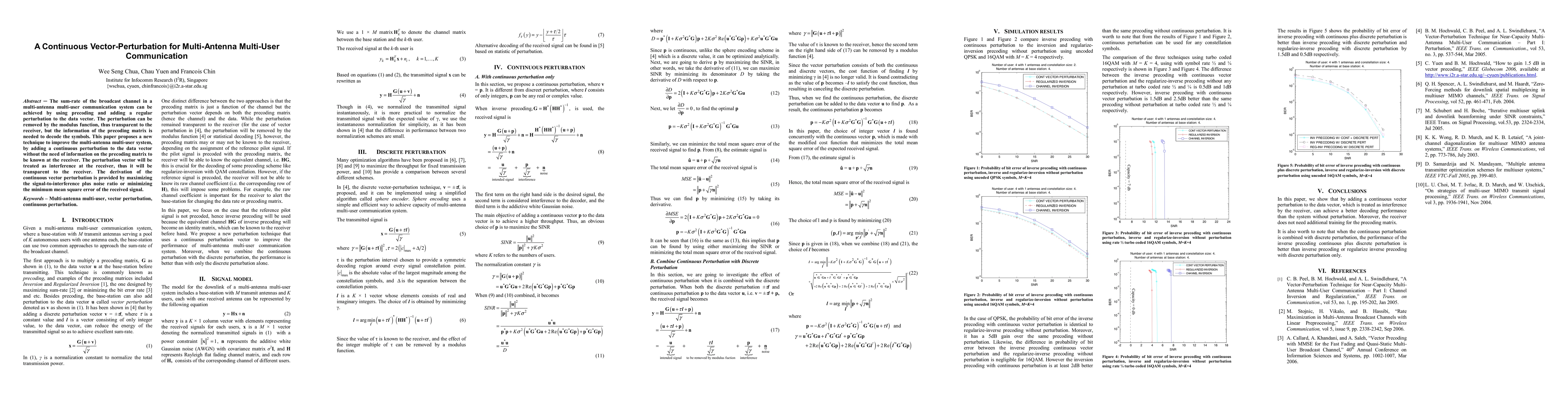 This paper proposes a continuous vector-perturbation technique for multi-antenna multi-user communication systems to enhance sum-rate without requiring precoding matrix information at the receiver, treating the perturbation as interference. The method is derived to maximize signal-to-interference plus noise ratio or minimize minimum mean square error.