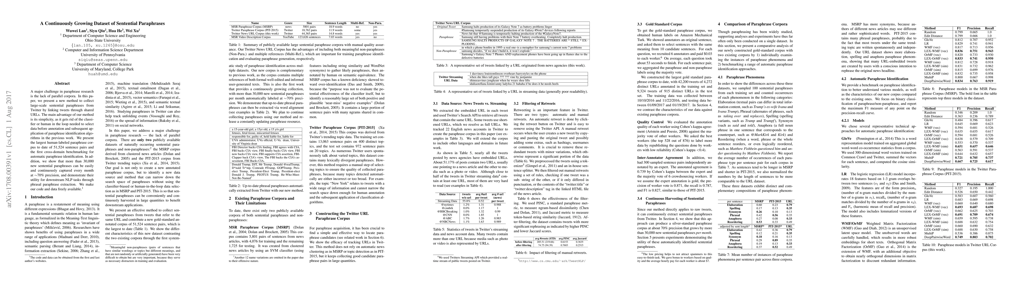 A major challenge in paraphrase research is the lack of parallel corpora. In this paper, we present a new method to collect large-scale sentential paraphrases from Twitter by linking tweets through shared URLs. The main advantage of our method is its simplicity, as it gets rid of the classifier or human in the loop needed to select data before annotation and subsequent application of paraphrase identification algorithms in the previous work. We present the largest human-labeled paraphrase corpus to date of 51,524 sentence pairs and the first cross-domain benchmarking for automatic paraphrase identification. In addition, we show that more than 30,000 new sentential paraphrases can be easily and continuously captured every month at ~70% precision, and demonstrate their utility for downstream NLP tasks through phrasal paraphrase extraction. We make our code and data freely available.