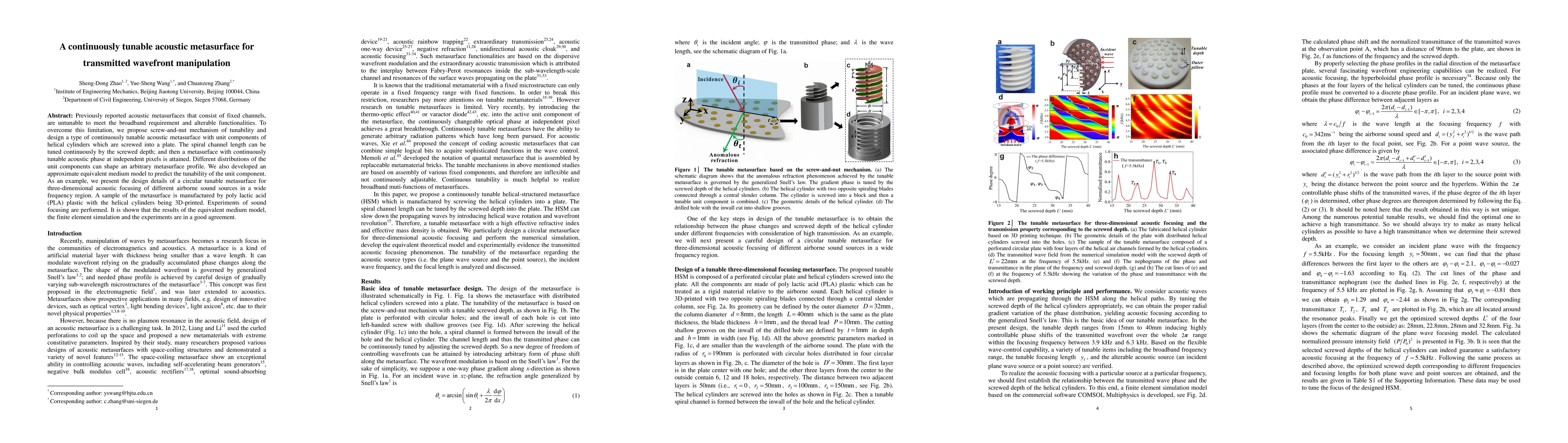 This paper introduces a continuously tunable acoustic metasurface using helical cylinders with a screw-and-nut mechanism, enabling broadband wavefront manipulation. The study demonstrates a 3D-printed PLA prototype and verifies its functionality through experiments, simulations, and theoretical modeling, showing good agreement among them.