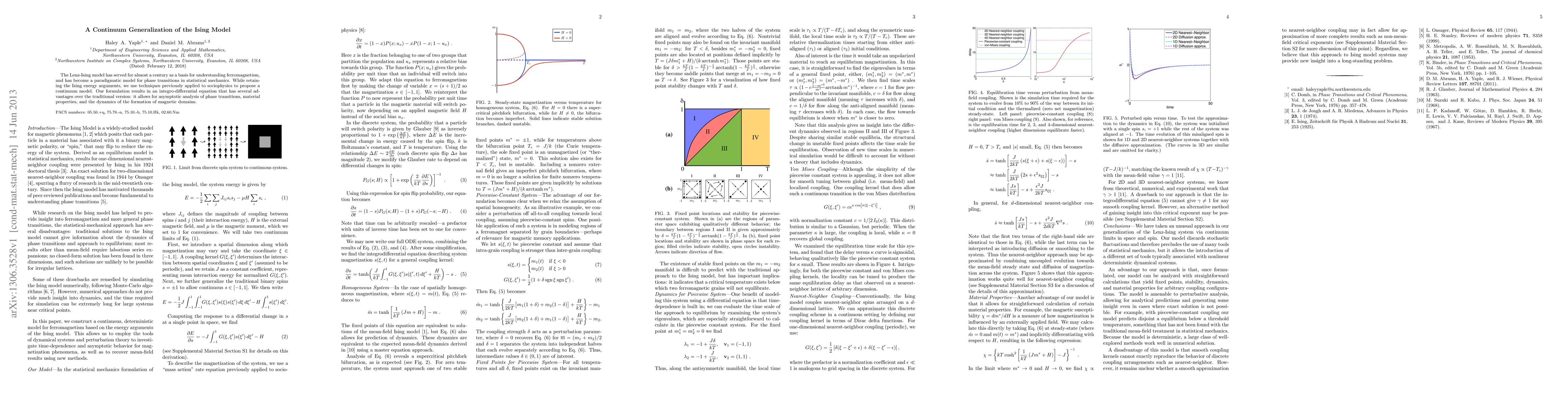 The Lenz-Ising model has served for almost a century as a basis for understanding ferromagnetism, and has become a paradigmatic model for phase transitions in statistical mechanics. While retaining the Ising energy arguments, we use techniques previously applied to sociophysics to propose a continuum model. Our formulation results in an integro-differential equation that has several advantages over the traditional version: it allows for asymptotic analysis of phase transitions, material properties, and the dynamics of the formation of magnetic domains.