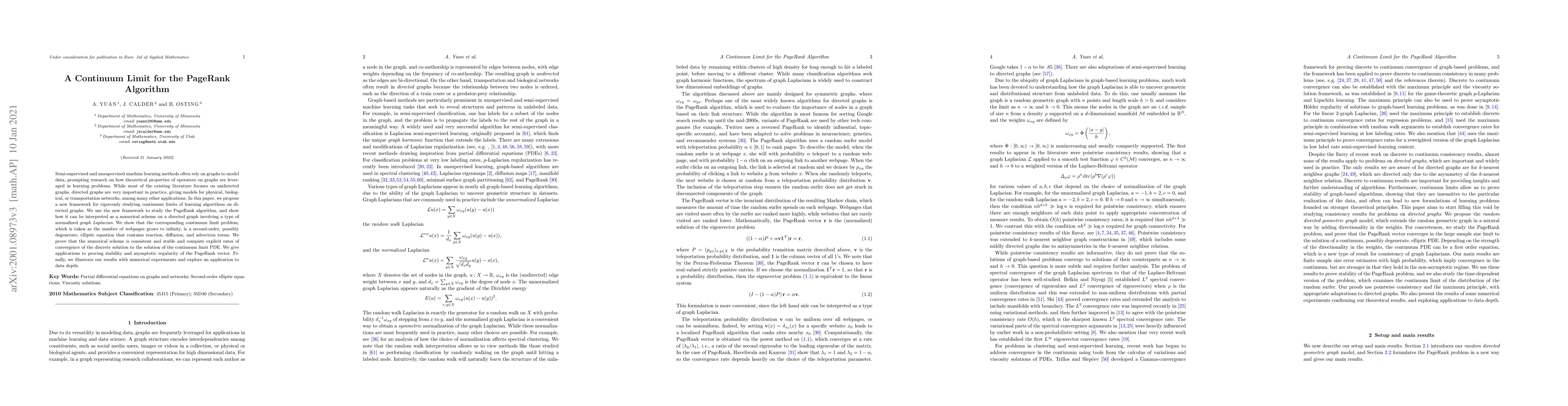 This paper proposes a new framework to study the continuum limits of learning algorithms on directed graphs, applying it to the PageRank algorithm. It shows that the PageRank algorithm corresponds to a numerical scheme on a directed graph, leading to a second-order elliptic PDE in the continuum limit, and proves the consistency, stability, and convergence rates of the numerical scheme.