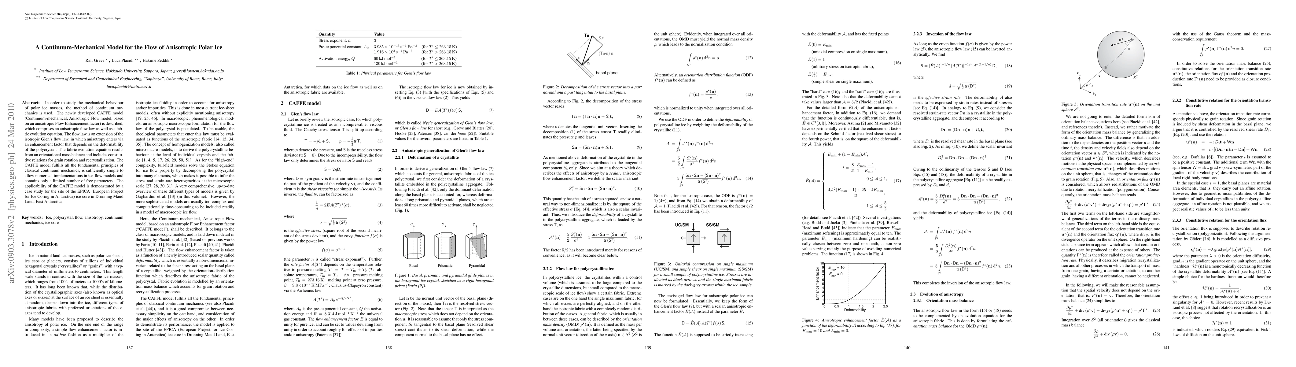 The CAFFE model is a continuum-mechanical framework for simulating the anisotropic flow of polar ice, extending Glen's flow law with an enhancement factor for anisotropy and incorporating fabric evolution. Its applicability is demonstrated through a case study at the EPICA ice core site in East Antarctica.
