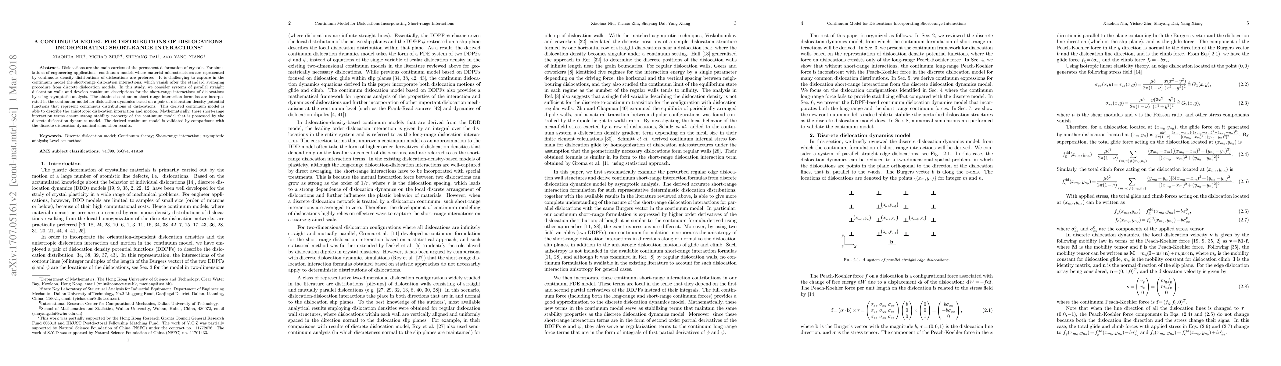 This paper develops a continuum model for dislocation dynamics that incorporates short-range interactions using asymptotic analysis and validates it by comparing with discrete dislocation simulations. The model captures anisotropic dislocation interactions and ensures strong stability, similar to the discrete model.