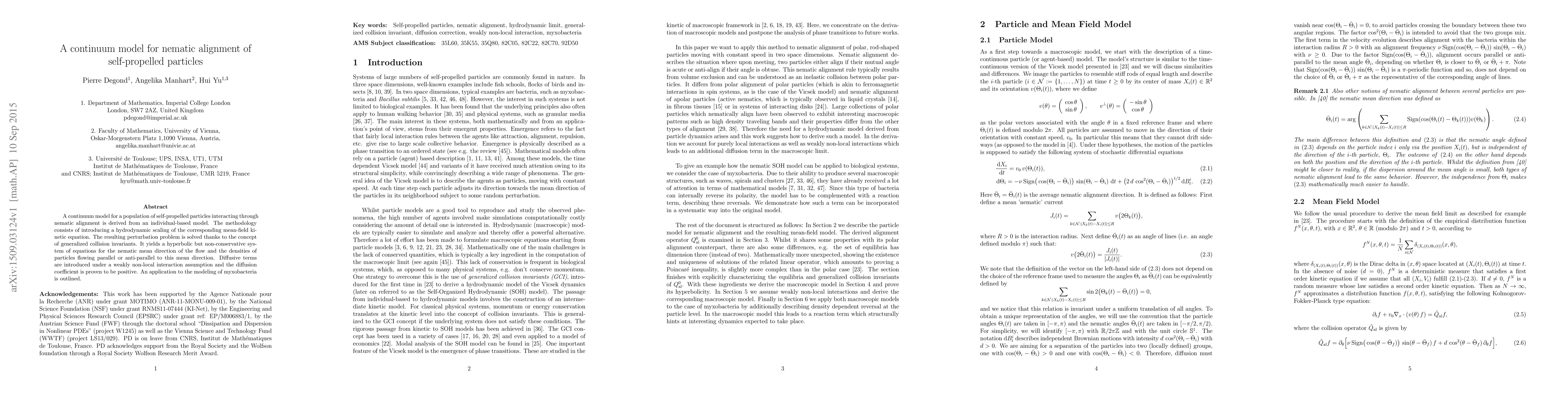 This paper derives a continuum model for self-propelled particles interacting through nematic alignment, solving a perturbation problem using generalized collision invariants to obtain a hyperbolic system. It introduces diffusive terms under weakly non-local interactions, proving a positive diffusion coefficient, and applies the model to myxobacteria.