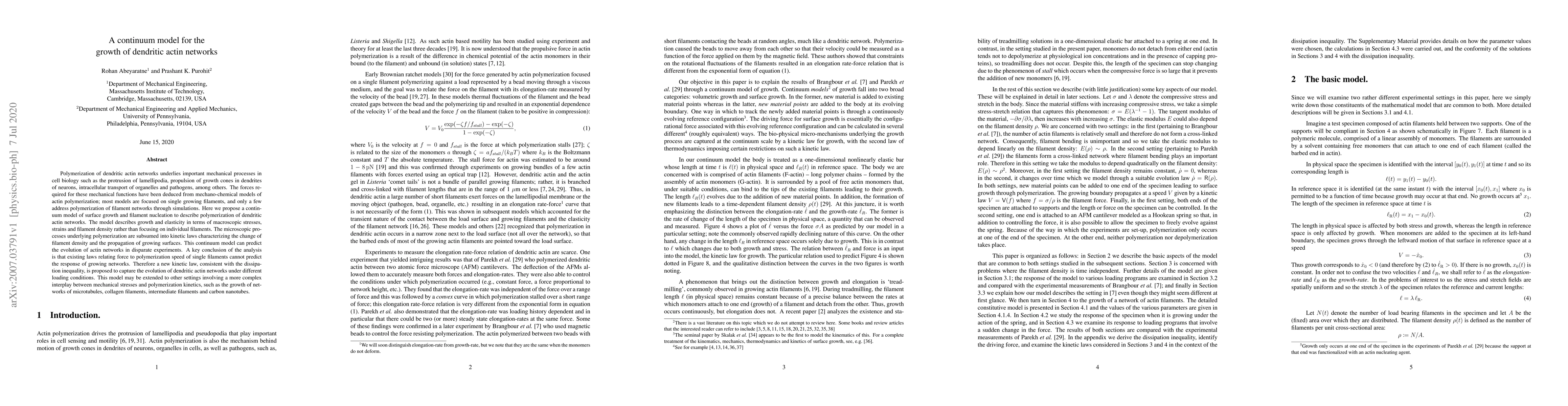This paper proposes a continuum model for the growth of dendritic actin networks, focusing on macroscopic stresses and strains rather than individual filaments. It highlights the inadequacy of existing laws for predicting network responses and introduces a new kinetic law for network evolution under various loading conditions.