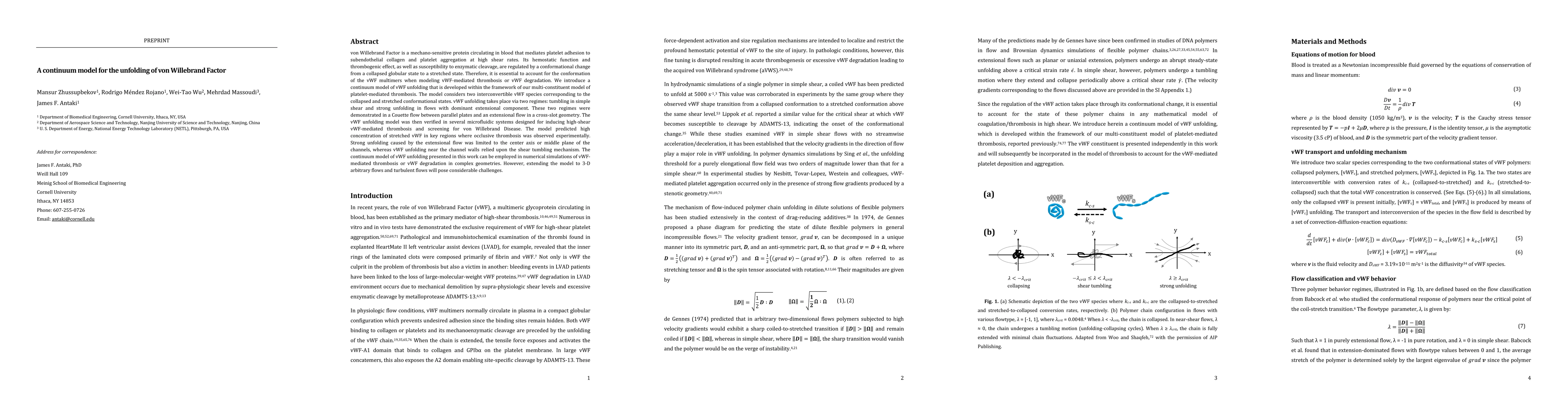 Researchers developed a continuum model to simulate the unfolding of von Willebrand Factor in blood, revealing two regimes of unfolding under different flow conditions, which were verified through microfluidic systems and predicted thrombosis regions.