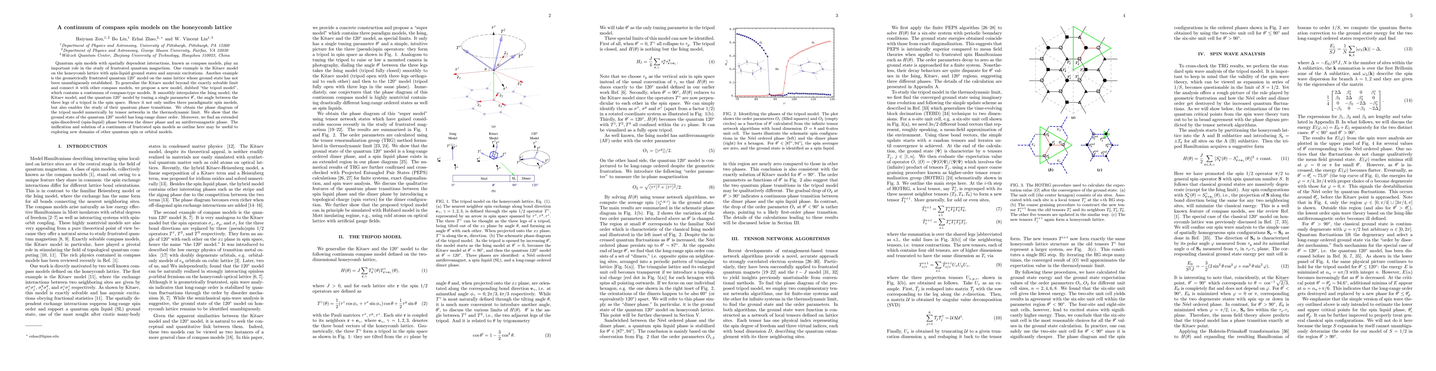 Quantum spin models with spatially dependent interactions, known as compass models, play an important role in the study of frustrated quantum magnetism. One example is the Kitaev model on the honeycomb lattice with spin-liquid ground states and anyonic excitations. Another example is the geometrically frustrated quantum $120^\circ$ model on the same lattice whose ground state has not been unambiguously established. To generalize the Kitaev model beyond the exactly solvable limit and connect it with other compass models, we propose a new model, dubbed "the tripod model", which contains a continuum of compass-type models. It smoothly interpolates the Ising model, the Kitaev model, and the quantum $120^\circ$ model by tuning a single parameter $\theta'$, the angle between the three legs of a tripod in the spin space. Hence it not only unifies three paradigmatic spin models, but also enables the study of their quantum phase transitions. We obtain the phase diagram of the tripod model numerically by tensor networks in the thermodynamic limit. We show that the ground state of the quantum $120^\circ$ model has long-range dimer order. Moreover, we find an extended spin-disordered (spin-liquid) phase between the dimer phase and an antiferromagnetic phase. The unification and solution of a continuum of frustrated spin models as outline here may be useful to exploring new domains of other quantum spin or orbital models.