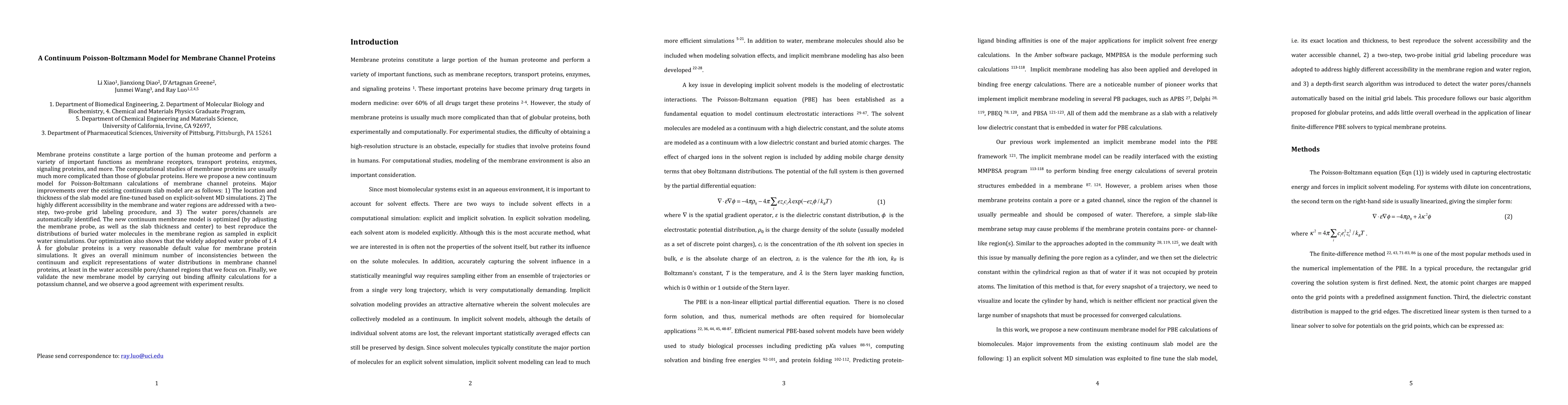 A new continuum Poisson-Boltzmann model for membrane channel proteins improves upon existing methods by fine-tuning location and thickness of the model, addressing accessibility differences between membrane and water regions, and automatically identifying water pores/channels.