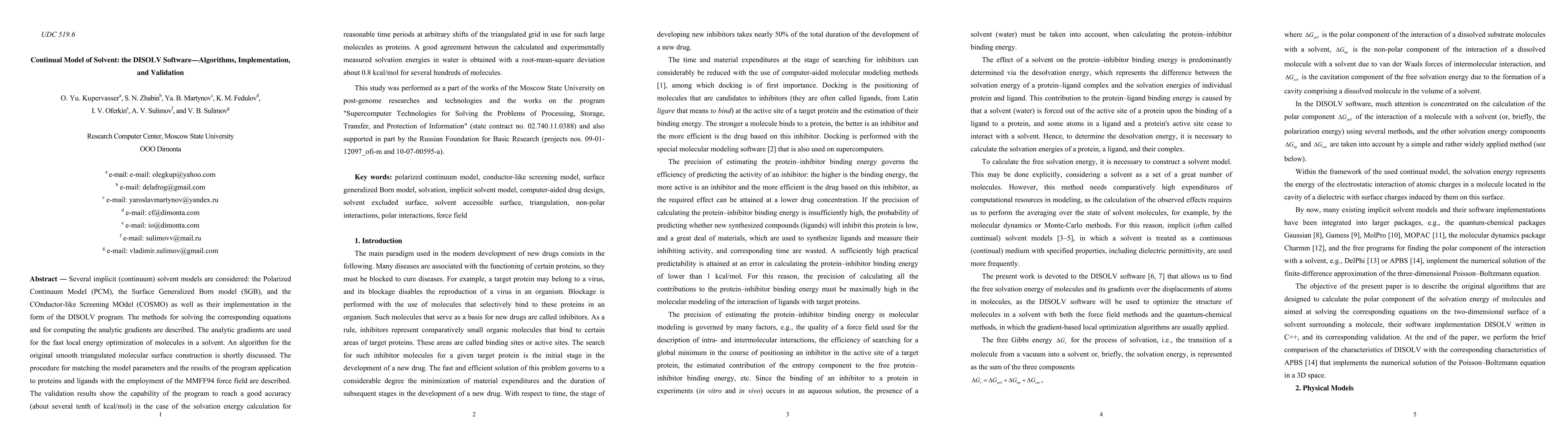 Several implicit (continuum) solvent models are considered: the Polarized Continuum Model (PCM), the Surface Generalized Born model (SGB), and the COnductor-like Screening model (COSMO) as well as their implementation in the form of the DISOLV program. The methods for solving the corresponding equations and for computing the analytic gradients are described. The analytic gradients are used for the fast local energy optimization of molecules in a solvent. An algorithm for the original smooth triangulated molecular surface construction is shortly discussed. The procedure for matching the model parameters and the results of the program application to proteins and ligands with the employment of the MMFF94 force field are described. The validation results show the capability of the program to reach a good accuracy (about several tenth of kcal/mol) in the case of the solvation energy calculation for reasonable time periods at arbitrary shifts of the triangulated grid in use for such large molecules as proteins. A good agreement between the calculated and experimentally measured solvation energies in water is obtained with a root-mean-square deviation about 0.8 kcal/mol for several hundreds of molecules.