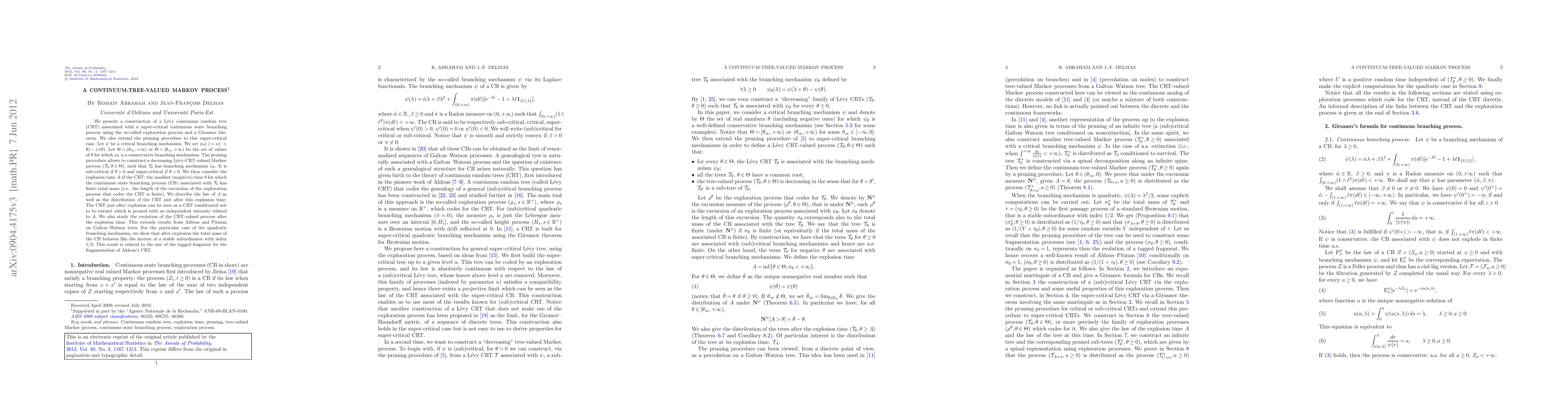 We present a construction of a L\'evy continuum random tree (CRT) associated with a super-critical continuous state branching process using the so-called exploration process and a Girsanov's theorem. We also extend the pruning procedure to this super-critical case. Let $\psi$ be a critical branching mechanism. We set $\psi_\theta(\cdot)=\psi(\cdot+\theta)-\psi(\theta)$. Let $\Theta=(\theta_\infty,+\infty)$ or $\Theta=[\theta_\infty,+\infty)$ be the set of values of $\theta$ for which $\psi_\theta$ is a branching mechanism. The pruning procedure allows to construct a decreasing L\'evy-CRT-valued Markov process $(\ct_\theta,\theta\in\Theta)$, such that $\mathcal{T}_\theta$ has branching mechanism $\psi_\theta$. It is sub-critical if $\theta>0$ and super-critical if $\theta<0$. We then consider the explosion time $A$ of the CRT: the smaller (negative) time $\theta$ for which $\mathcal{T}_\theta$ has finite mass. We describe the law of $A$ as well as the distribution of the CRT just after this explosion time. The CRT just after explosion can be seen as a CRT conditioned not to be extinct which is pruned with an independent intensity related to $A$. We also study the evolution of the CRT-valued process after the explosion time. This extends results from Aldous and Pitman on Galton-Watson trees. For the particular case of the quadratic branching mechanism, we show that after explosion the total mass of the CRT behaves like the inverse of a stable subordinator with index 1/2. This result is related to the size of the tagged fragment for the fragmentation of Aldous' CRT.