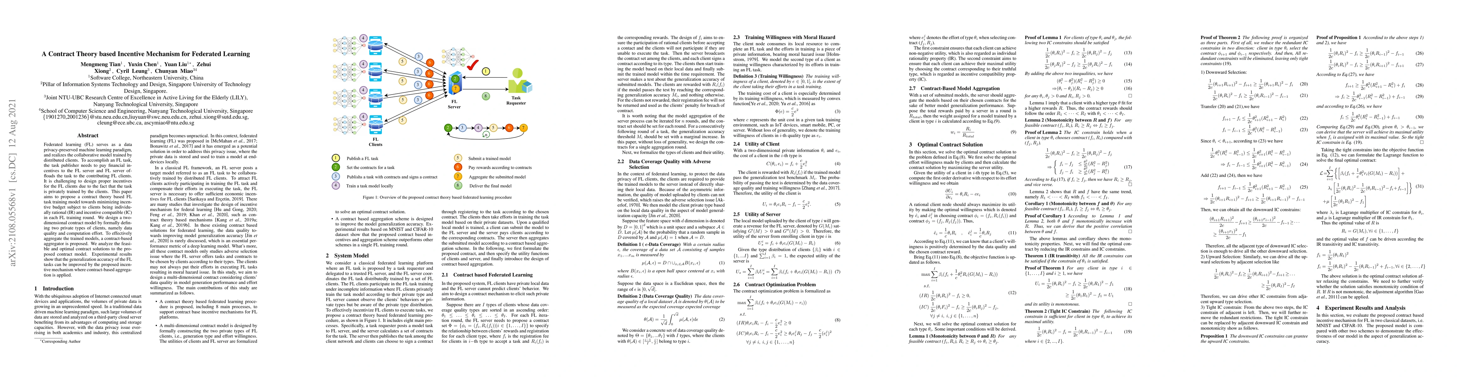 This paper proposes a contract theory-based incentive mechanism for federated learning to minimize incentive costs while ensuring client participation is individually rational and incentive compatible. The model defines two client types based on data quality and computation effort, and introduces a contract-based aggregator to improve model training accuracy and generalization.