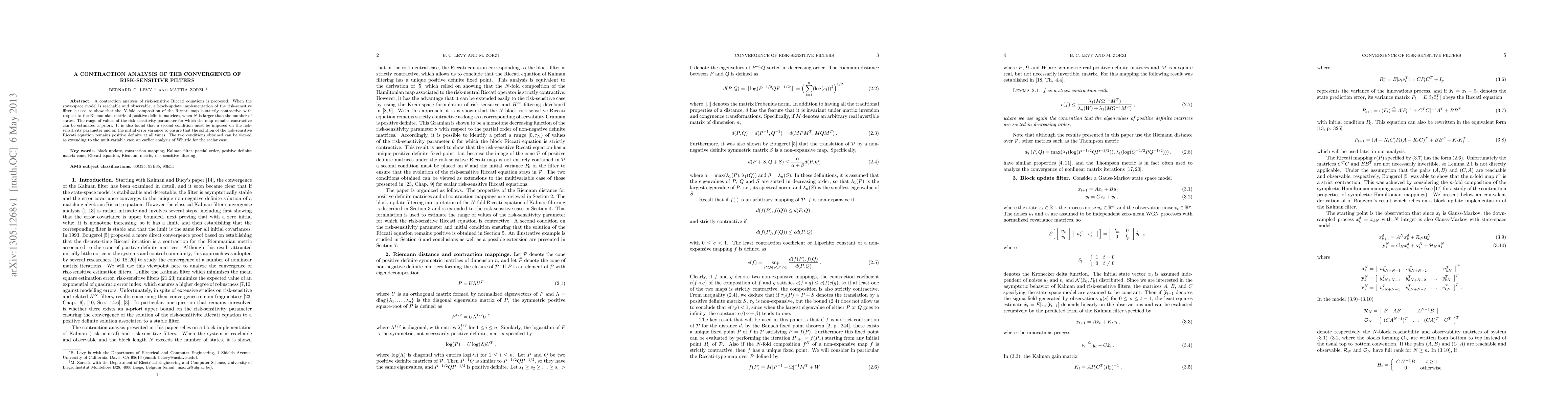 A contraction analysis of risk-sensitive Riccati equations is proposed. When the state-space model is reachable and observable, a block-update implementation of the risk-sensitive filter is used to show that the N-fold composition of the Riccati map is strictly contractive with respect to the Riemannian metric of positive definite matrices, when N is larger than the number of states. The range of values of the risk-sensitivity parameter for which the map remains contractive can be estimated a priori. It is also found that a second condition must be imposed on the risk-sensitivity parameter and on the initial error variance to ensure that the solution of the risk-sensitive Riccati equation remains positive definite at all times. The two conditions obtained can be viewed as extending to the multivariable case an earlier analysis of Whittle for the scalar case.