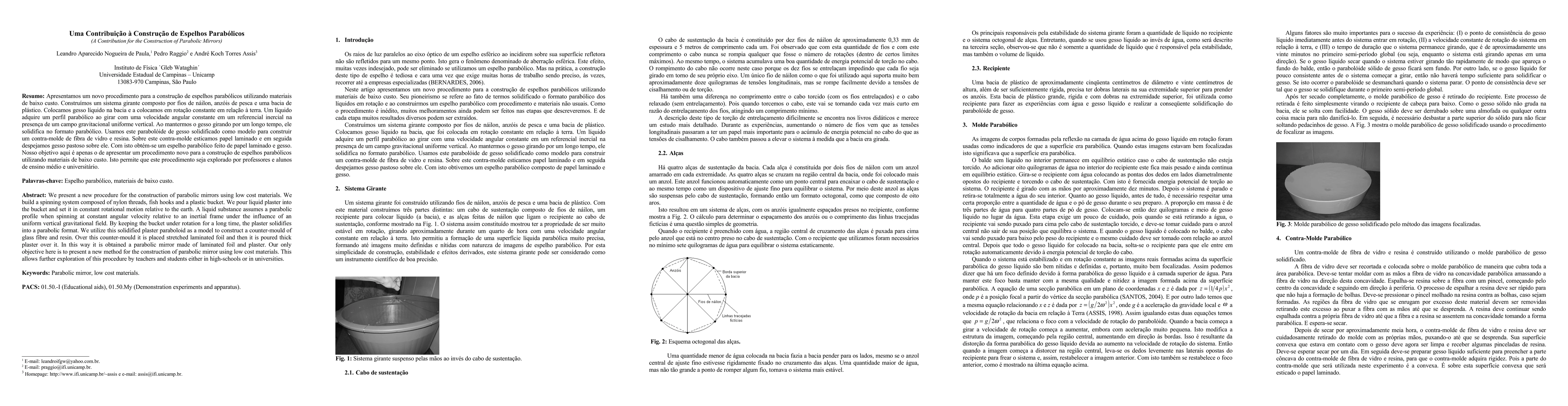 We present a new procedure for the construction of parabolic mirrors using low cost materials. We build a spinning system composed of nylon threads, fish hooks and a plastic bucket. We pour liquid plaster into the bucket and set it in constant rotational motion relative to the earth. A liquid substance assumes a parabolic profile when spinning at constant angular velocity relative to an inertial frame under the influence of an uniform vertical gravitational field. By keeping the bucket under rotation for a long time, the plaster solidifies into a parabolic format. We utilize this solidified plaster paraboloid as a model to construct a counter-mould of glass fibre and resin. Over this counter-mould it is placed stretched laminated foil and then it is poured thick plaster over it. In this way it is obtained a parabolic mirror made of laminated foil and plaster. Our only objective here is to present a new method for the construction of parabolic mirror using low cost materials. This allows further exploration of this procedure by teachers and students either in high-schools or in universities.