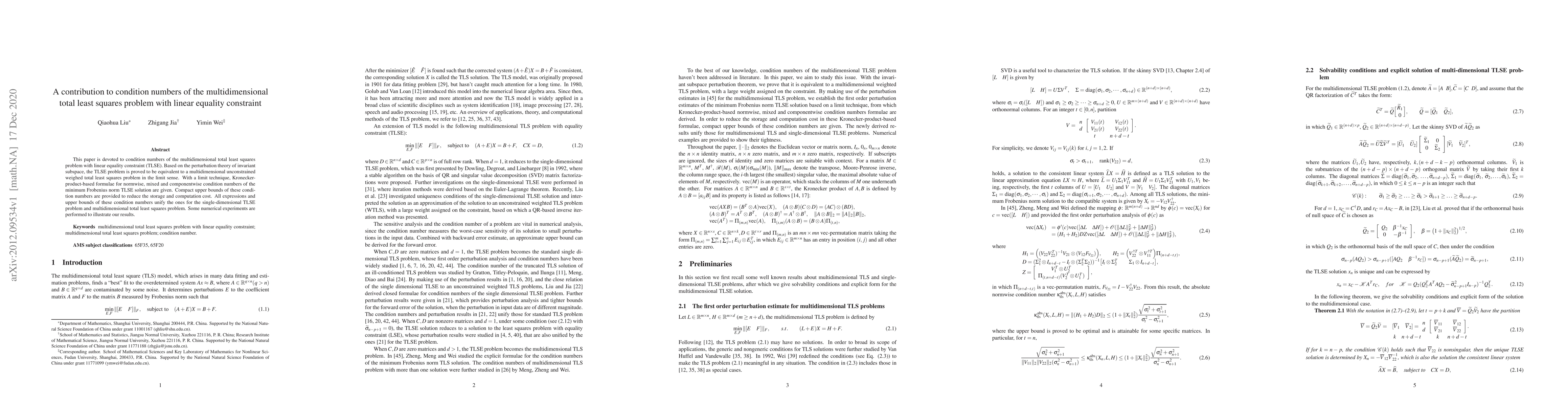 This paper investigates condition numbers for the multidimensional total least squares problem with linear equality constraints, proving its equivalence to an unconstrained weighted problem. It provides Kronecker-product-based formulae for various condition numbers and offers compact upper bounds to optimize computational efficiency.