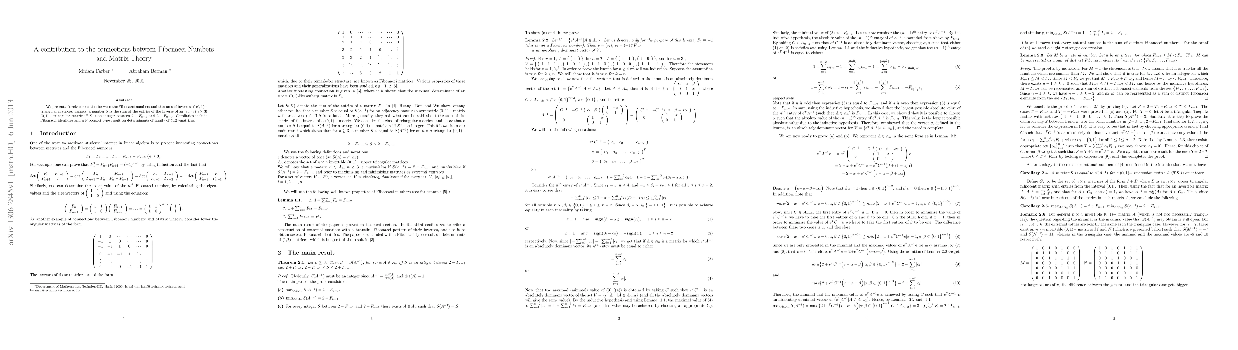 This paper establishes a connection between Fibonacci numbers and matrix theory, showing that the sum of entries in the inverse of an n x n triangular matrix is equal to an integer range related to F_n-1.