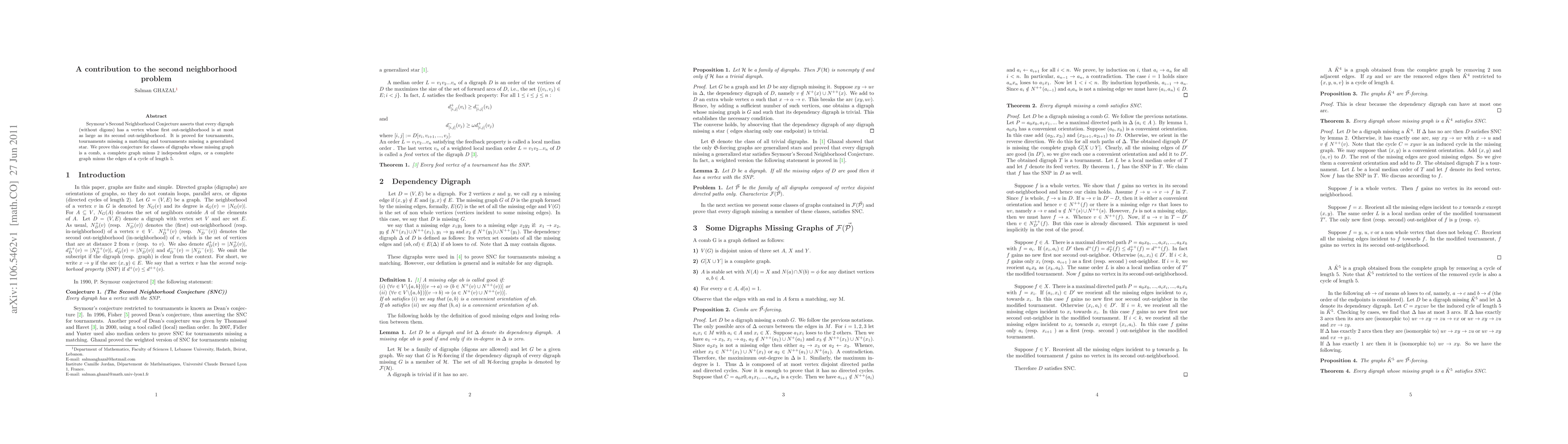 Seymour's Second Neighborhood Conjecture asserts that every digraph (without digons) has a vertex whose first out-neighborhood is at most as large as its second out-neighborhood. It is proved for tournaments, tournaments missing a matching and tournaments missing a generalized star. We prove this conjecture for classes of digraphs whose missing graph is a comb, a complete graph minus 2 independent edges, or a complete graph minus the edges of a cycle of length 5.