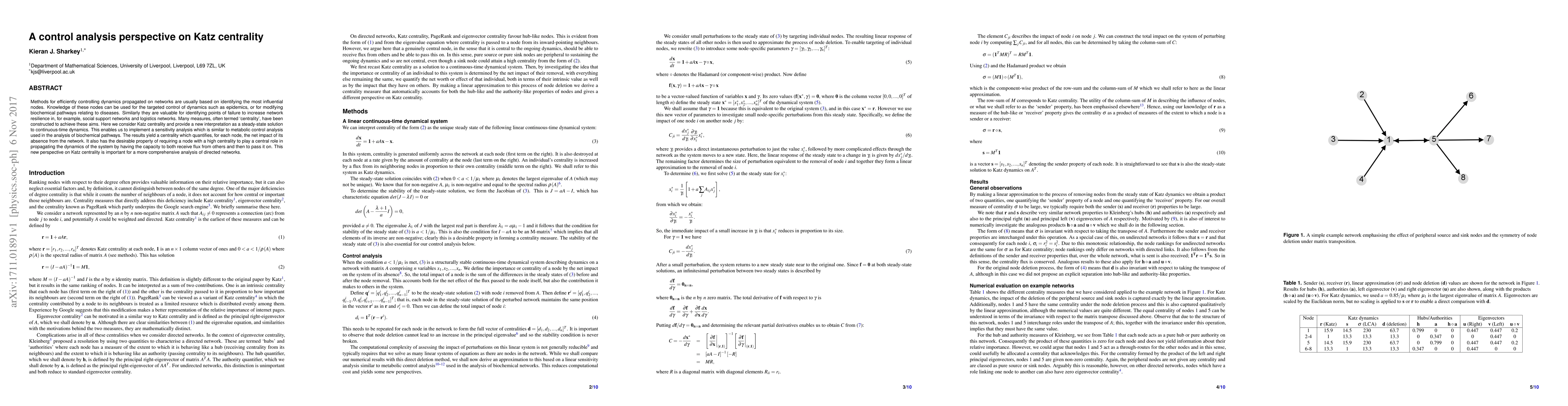 Methods for efficiently controlling dynamics propagated on networks are usually based on identifying the most influential nodes. Knowledge of these nodes can be used for the targeted control of dynamics such as epidemics, or for modifying biochemical pathways relating to diseases. Similarly they are valuable for identifying points of failure to increase network resilience in, for example, social support networks and logistics networks. Many measures, often termed `centrality', have been constructed to achieve these aims. Here we consider Katz centrality and provide a new interpretation as a steady-state solution to continuous-time dynamics. This enables us to implement a sensitivity analysis which is similar to metabolic control analysis used in the analysis of biochemical pathways. The results yield a centrality which quantifies, for each node, the net impact of its absence from the network. It also has the desirable property of requiring a node with a high centrality to play a central role in propagating the dynamics of the system by having the capacity to both receive flux from others and then to pass it on. This new perspective on Katz centrality is important for a more comprehensive analysis of directed networks.