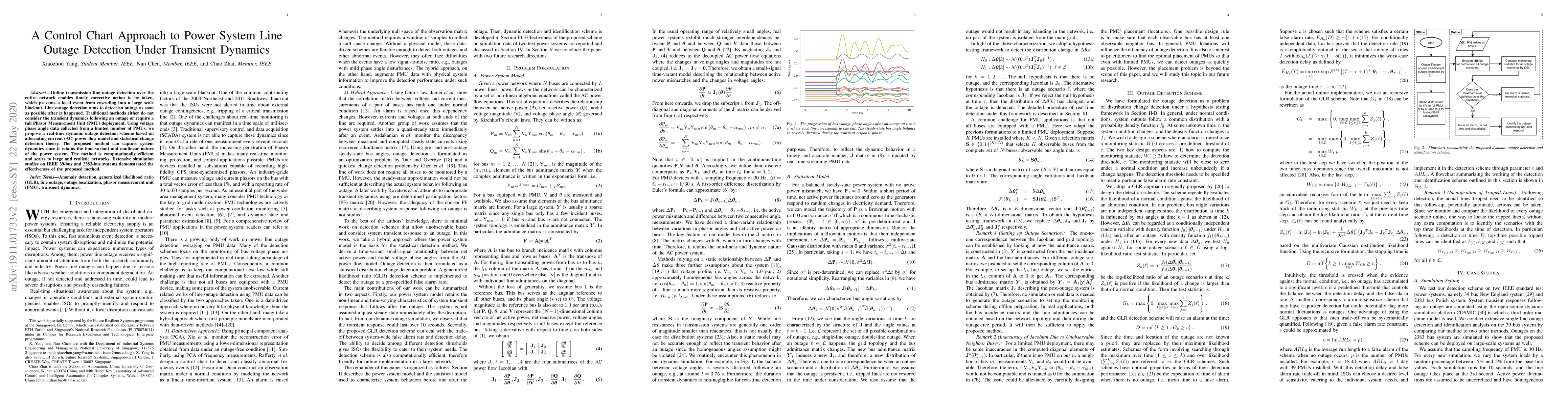 This paper proposes a real-time control chart approach for detecting transmission line outages using limited PMU data and an AC power flow model, capturing transient dynamics without full PMU deployment. Simulation results on IEEE 39-bus and 2383-bus systems demonstrate the method's efficiency and scalability.