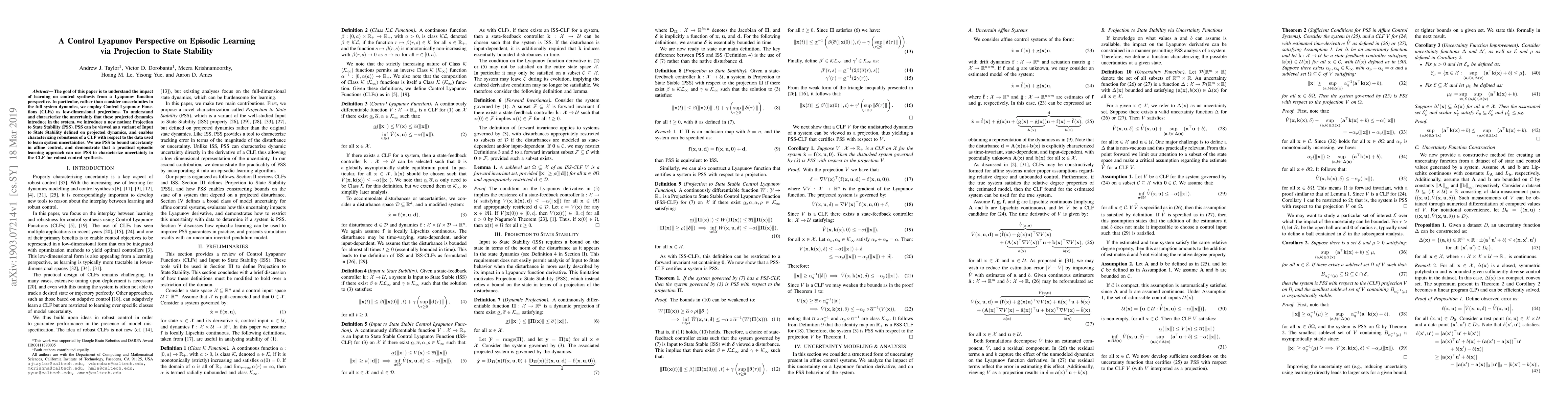 The goal of this paper is to understand the impact of learning on control synthesis from a Lyapunov function perspective. In particular, rather than consider uncertainties in the full system dynamics, we employ Control Lyapunov Functions (CLFs) as low-dimensional projections. To understand and characterize the uncertainty that these projected dynamics introduce in the system, we introduce a new notion: Projection to State Stability (PSS). PSS can be viewed as a variant of Input to State Stability defined on projected dynamics, and enables characterizing robustness of a CLF with respect to the data used to learn system uncertainties. We use PSS to bound uncertainty in affine control, and demonstrate that a practical episodic learning approach can use PSS to characterize uncertainty in the CLF for robust control synthesis.