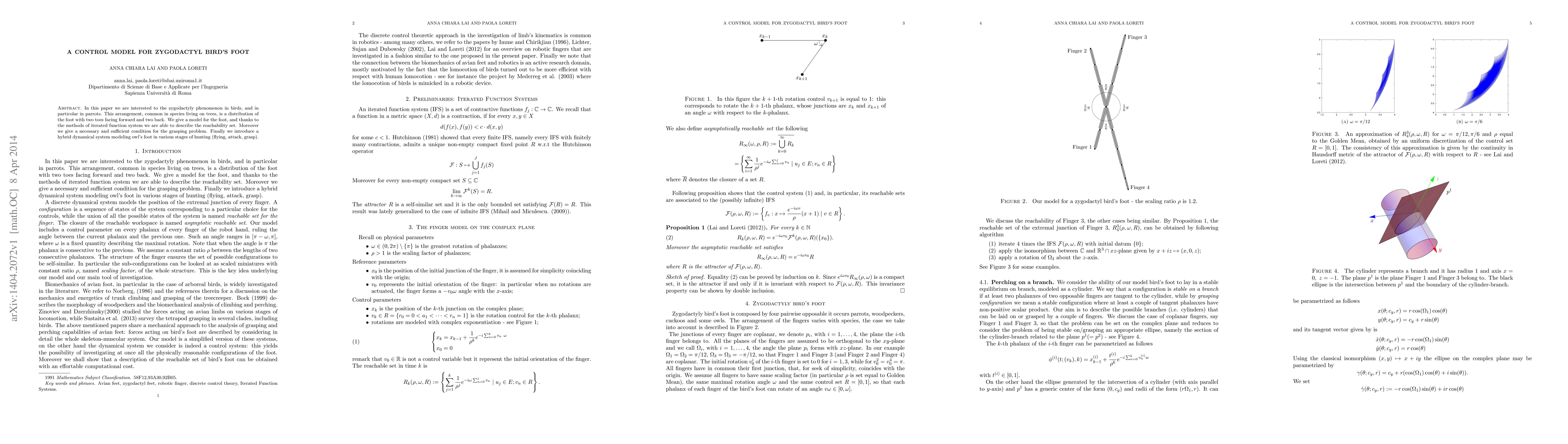 In this paper we are interested to the zygodactyly phenomenon in birds, and in particolar in parrots. This arrangement, common in species living on trees, is a distribution of the foot with two toes facing forward and two back. We give a model for the foot, and thanks to the methods of iterated function system we are able to describe the reachability set. Moreover we give a necessary and sufficient condition for the grasping problem. Finally we introduce a hybrid dynamical system modeling owl's foot in various stages of hunting (flying, attack, grasp).