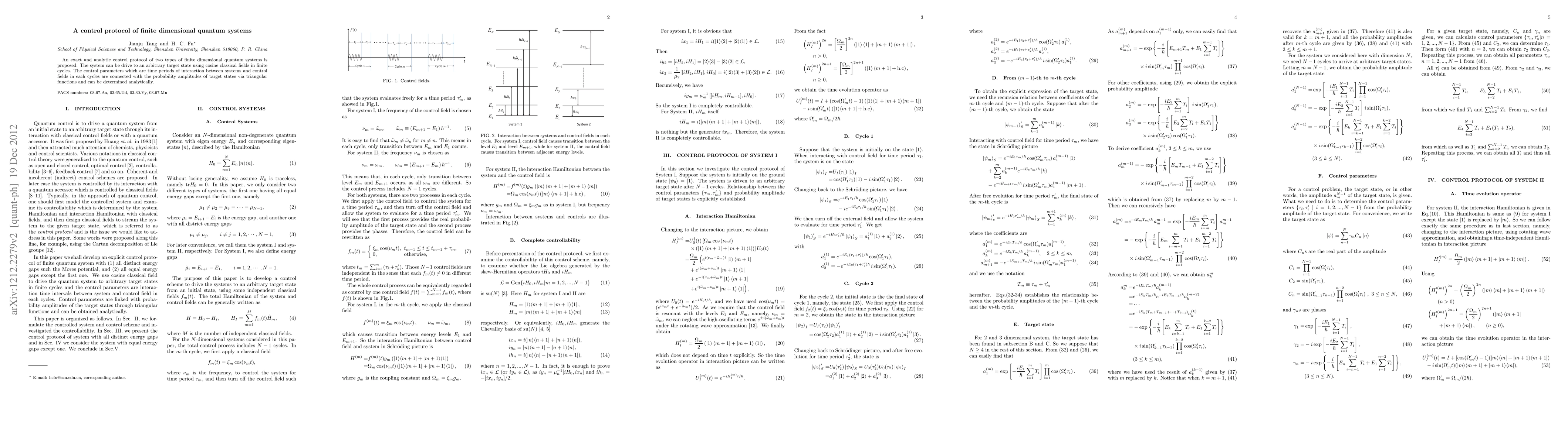 This paper proposes an exact analytic control protocol for finite dimensional quantum systems, enabling the drive to any target state using cosine classical fields in finite cycles, with control parameters determined analytically through triangular functions.