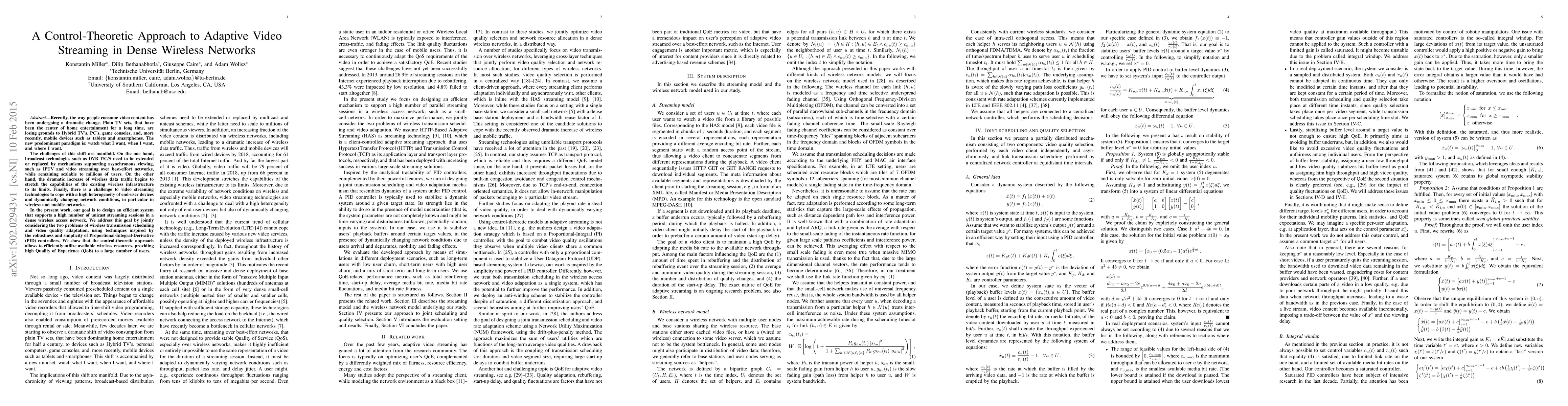 This paper proposes a control-theoretic approach to adaptive video streaming in dense wireless networks, improving Quality of Experience for a large number of users.