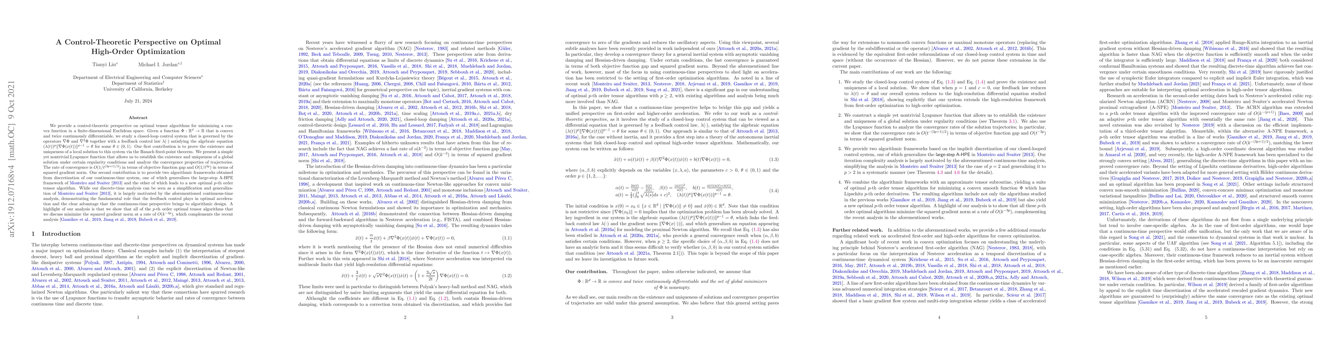 We provide a control-theoretic perspective on optimal tensor algorithms for minimizing a convex function in a finite-dimensional Euclidean space. Given a function $\Phi: \mathbb{R}^d \rightarrow \mathbb{R}$ that is convex and twice continuously differentiable, we study a closed-loop control system that is governed by the operators $\nabla \Phi$ and $\nabla^2 \Phi$ together with a feedback control law $\lambda(\cdot)$ satisfying the algebraic equation $(\lambda(t))^p\|\nabla\Phi(x(t))\|^{p-1} = \theta$ for some $\theta \in (0, 1)$. Our first contribution is to prove the existence and uniqueness of a local solution to this system via the Banach fixed-point theorem. We present a simple yet nontrivial Lyapunov function that allows us to establish the existence and uniqueness of a global solution under certain regularity conditions and analyze the convergence properties of trajectories. The rate of convergence is $O(1/t^{(3p+1)/2})$ in terms of objective function gap and $O(1/t^{3p})$ in terms of squared gradient norm. Our second contribution is to provide two algorithmic frameworks obtained from discretization of our continuous-time system, one of which generalizes the large-step A-HPE framework and the other of which leads to a new optimal $p$-th order tensor algorithm. While our discrete-time analysis can be seen as a simplification and generalization of~\citet{Monteiro-2013-Accelerated}, it is largely motivated by the aforementioned continuous-time analysis, demonstrating the fundamental role that the feedback control plays in optimal acceleration and the clear advantage that the continuous-time perspective brings to algorithmic design. A highlight of our analysis is that we show that all of the $p$-th order optimal tensor algorithms that we discuss minimize the squared gradient norm at a rate of $O(k^{-3p})$, which complements the recent analysis.
