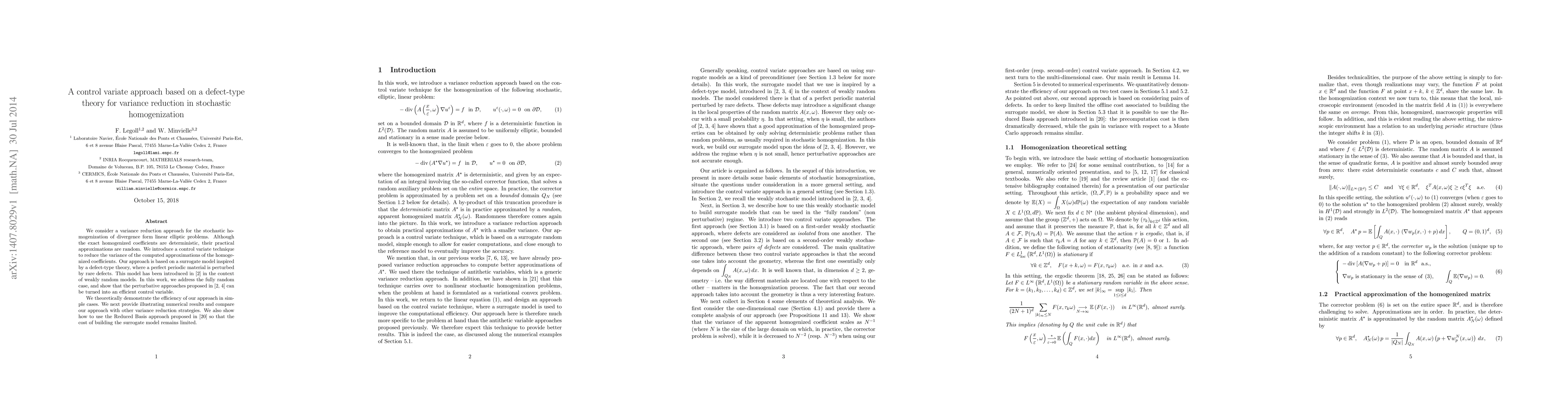 This paper introduces a control variate technique for variance reduction in stochastic homogenization of linear elliptic problems, leveraging a defect-type theory-based surrogate model. The authors demonstrate the efficiency of their approach theoretically and numerically, comparing it with other variance reduction methods.