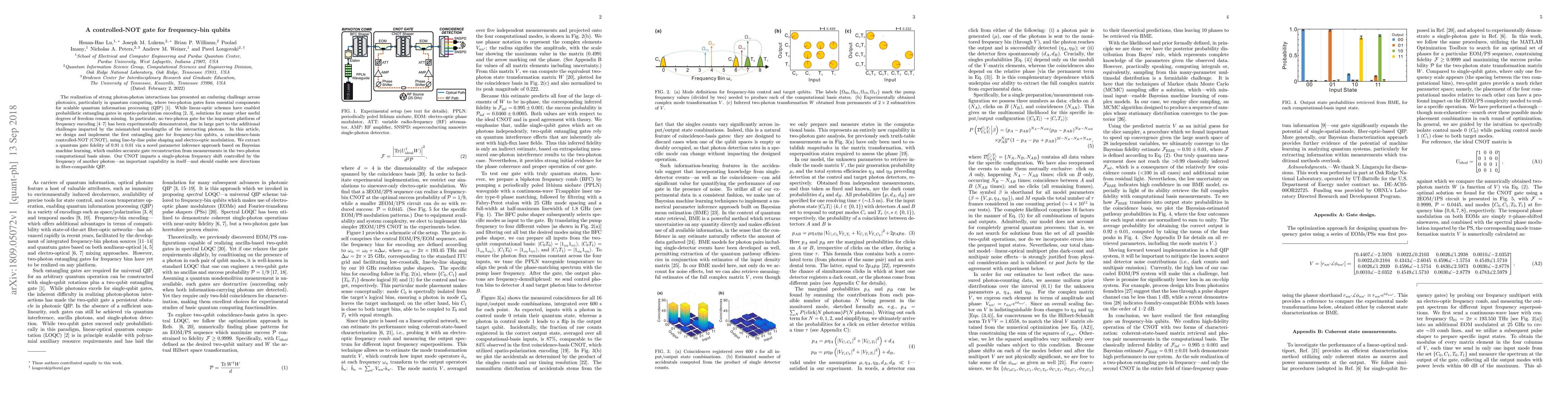 The realization of strong photon-photon interactions has presented an enduring challenge across photonics, particularly in quantum computing, where two-photon gates form essential components for scalable quantum information processing (QIP). While linear-optic schemes have enabled probabilistic entangling gates in spatio-polarization encoding, solutions for many other useful degrees of freedom remain missing. In particular, no two-photon gate for the important platform of frequency encoding has been experimentally demonstrated, due in large part to the additional challenges imparted by the mismatched wavelengths of the interacting photons. In this article, we design and implement the first entangling gate for frequency-bin qubits, a coincidence-basis controlled-NOT (CNOT), using line-by-line pulse shaping and electro-optic modulation. We extract a quantum gate fidelity of $0.91 \pm 0.01$ via a novel parameter inference approach based on Bayesian machine learning, which enables accurate gate reconstruction from measurements in the two-photon computational basis alone. Our CNOT imparts a single-photon frequency shift controlled by the frequency of another photon---an important capability in itself---and should enable new directions in fiber-compatible QIP.