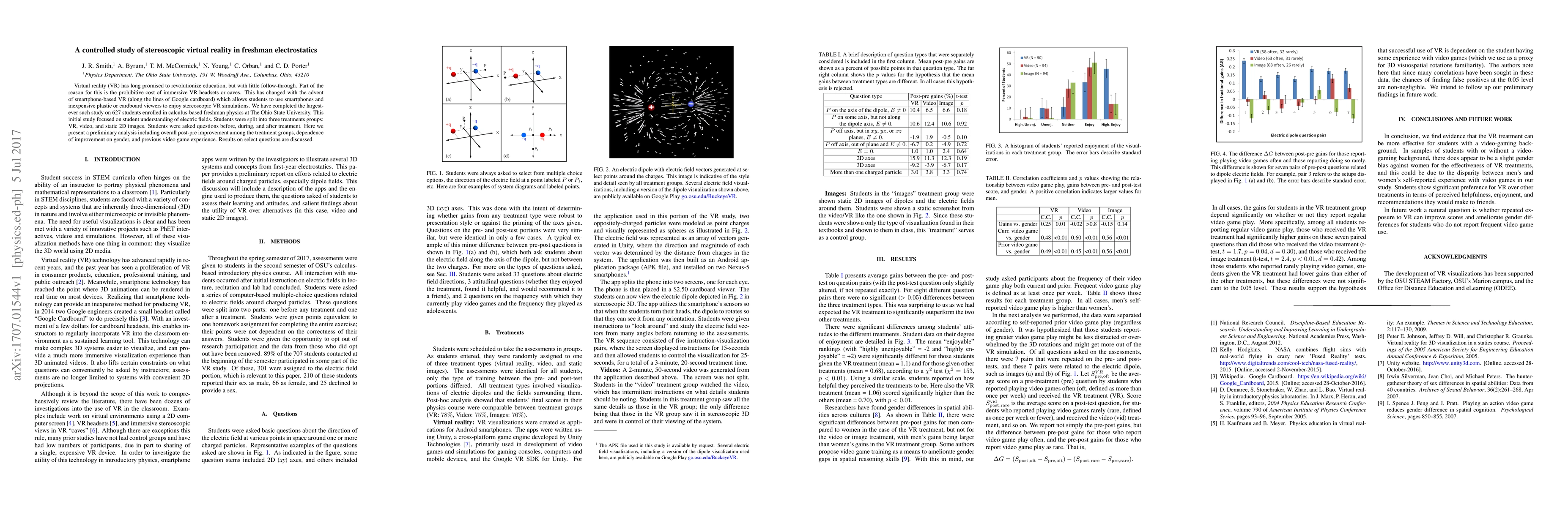Virtual reality (VR) has long promised to revolutionize education, but with little follow-through. Part of the reason for this is the prohibitive cost of immersive VR headsets or caves. This has changed with the advent of smartphone-based VR (along the lines of Google cardboard) which allows students to use smartphones and inexpensive plastic or cardboard viewers to enjoy stereoscopic VR simulations. We have completed the largest-ever such study on 627 students enrolled in calculus-based freshman physics at The Ohio State University. This initial study focused on student understanding of electric fields. Students were split into three treatments groups: VR, video, and static 2D images. Students were asked questions before, during, and after treatment. Here we present a preliminary analysis including overall post-pre improvement among the treatment groups, dependence of improvement on gender, and previous video game experience. Results on select questions are discussed. Several electric field visualizations similar to those used in this study are freely available on Google Play http://go.osu.edu/BuckeyeVR