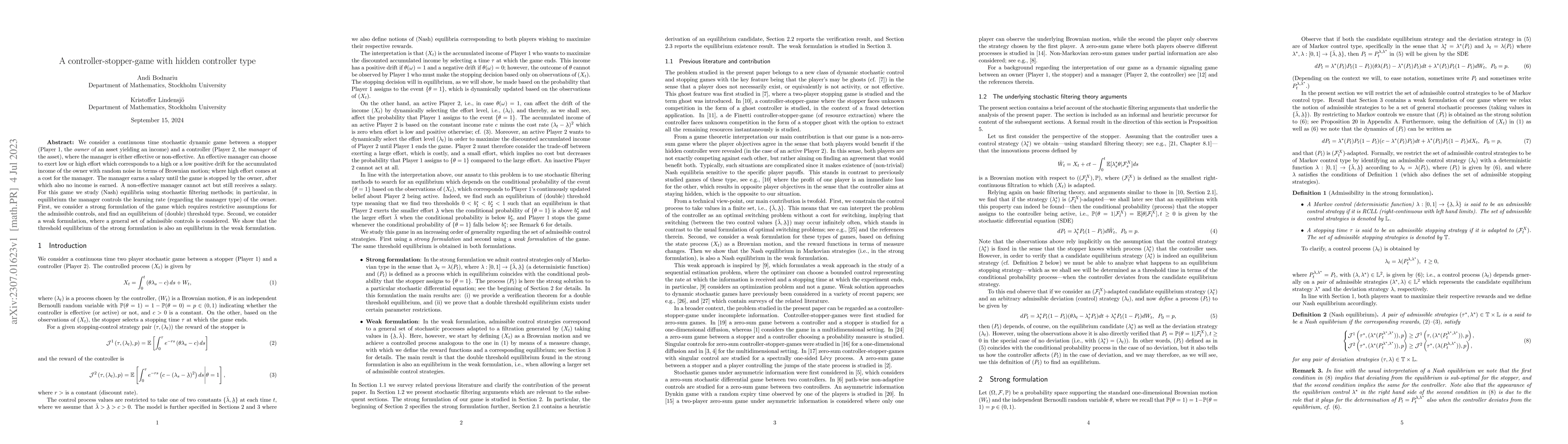 We consider a continuous time stochastic dynamic game between a stopper (Player $1$, the \textit{owner} of an asset yielding an income) and a controller (Player $2$, the \textit{manager} of the asset), where the manager is either effective or non-effective. An effective manager can choose to exert low or high effort which corresponds to a high or a low positive drift for the accumulated income of the owner with random noise in terms of Brownian motion; where high effort comes at a cost for the manager. The manager earns a salary until the game is stopped by the owner, after which also no income is earned. A non-effective manager cannot act but still receives a salary. For this game we study (Nash) equilibria using stochastic filtering methods; in particular, in equilibrium the manager controls the learning rate (regarding the manager type) of the owner. First, we consider a strong formulation of the game which requires restrictive assumptions for the admissible controls, and find an equilibrium of (double) threshold type. Second, we consider a weak formulation, where a general set of admissible controls is considered. We show that the threshold equilibrium of the strong formulation is also an equilibrium in the weak formulation.