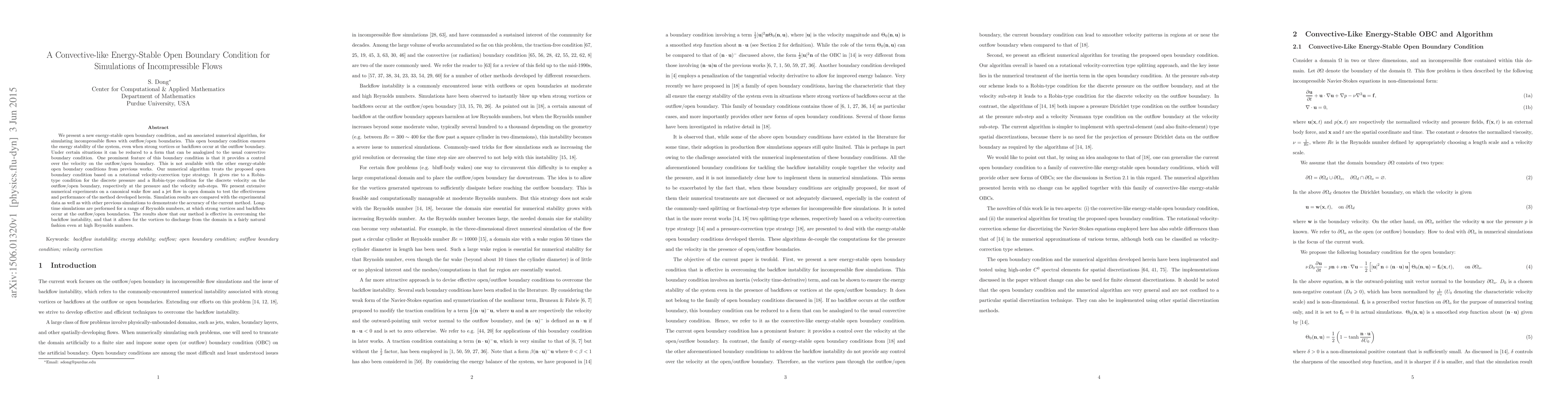 This paper introduces a new energy-stable open boundary condition for simulating incompressible flows with outflow boundaries, ensuring stability even with strong vortices or backflows. The method provides control over velocity at the outflow boundary, unlike previous approaches, and is tested effectively through numerical simulations of wake and jet flows.